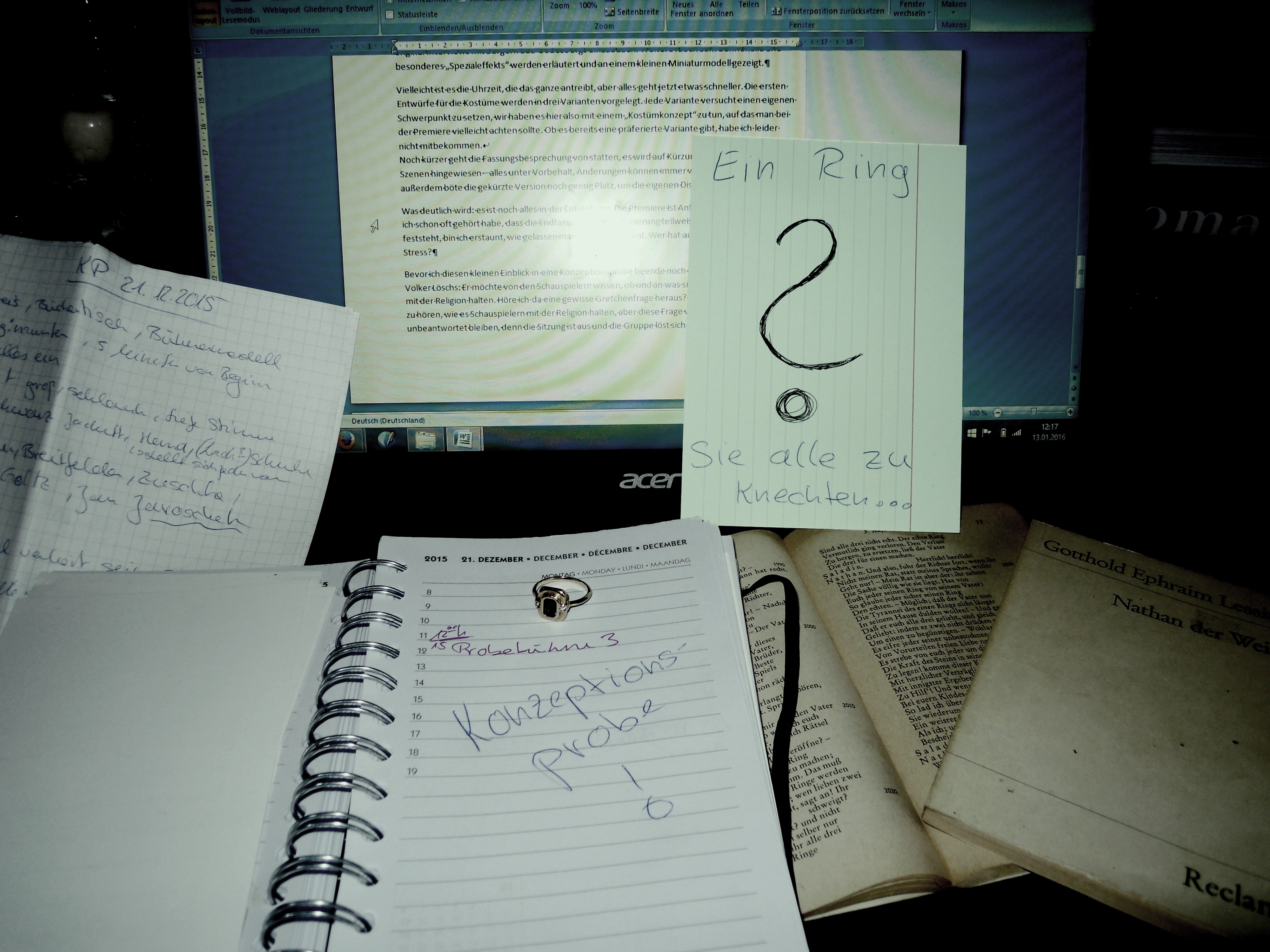 Ich beende diesen kleinen Einblick in die Konzeptionsprobe mit Volker Löschs Hausaufgabe an die Schauspieler: Sie sollen darüber nachdenken, ob und an was sie glauben und wie sie es mit der Religion halten. Er selbst, so sagt er, sei Atheist. Gute Voraussetzungen für eine Parabel, die sich ursprünglich um Glaubenstoleranz drehte. Es wäre auch für mich spannend zu hören, welche Antworten die Schauspieler ihm geben, aber diese Frage wird wohl vorerst unbeantwortet bleiben müssen, denn die Sitzung ist aus und die Gruppe löst sich auf, um sich in ein paar Stunden erneut zu treffen – allerdings ohne mich. Ich hab Feierabend und denke über die vielen Eindrücke nach, die mir dieser Tag beschert hat.