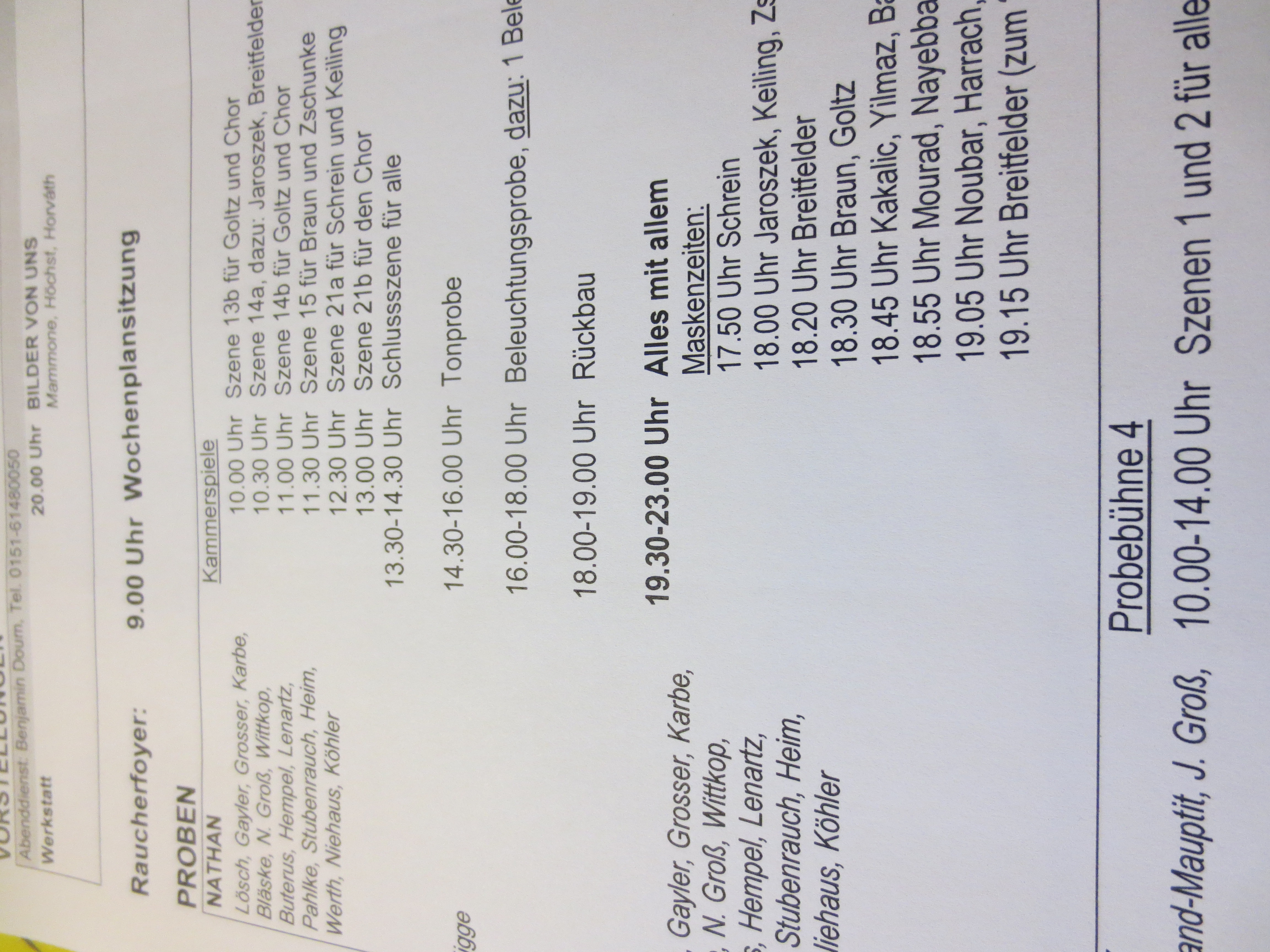Am Abend des 2. Februar bekamen wir einen exklusiven Einblick in die AMA von Nathan. AMA ist die Abkürzung für ,,Alles mit Allem“, d.h. ein erster Durchlauf des Stückes mit Kostüm, Bühnenbild, Lichttechnik, Musik usw. Dieser Artikel soll nicht einfach nur den Inhalt von Volker Löschs Produktion wiedergeben sondern, was wir euch vermitteln wollen, ist die Stimmung, der Ablauf und die Eindrücke, die wir an dem Abend erlebt haben.