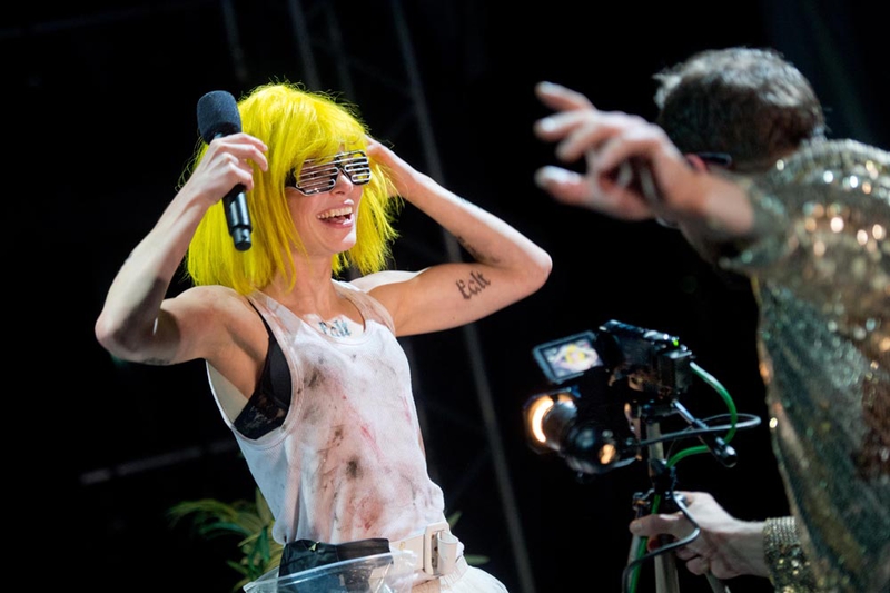 Es wirkt wie ein Dschungel: Pflanzen stehen herum, der Boden ist mit Wasser geflutet, dazu hängen – völlig deplatziert wirkend – Fernseher und große Leinwände über der Szenerie. Ein Baumhaus gibt es und auf einer Anhöhe steht ein Schreibtisch, über dem der Spruch „Der deutschen Wirtschaft“ prangert. Das Wasser ist das alles einnehmende Element, weshalb mit Wasserspritzern gerechnet werden muss, aber das Theater hat vorgesorgt: Die erste Reihe findet auf ihren Plätzen einen Regenschutz vor.