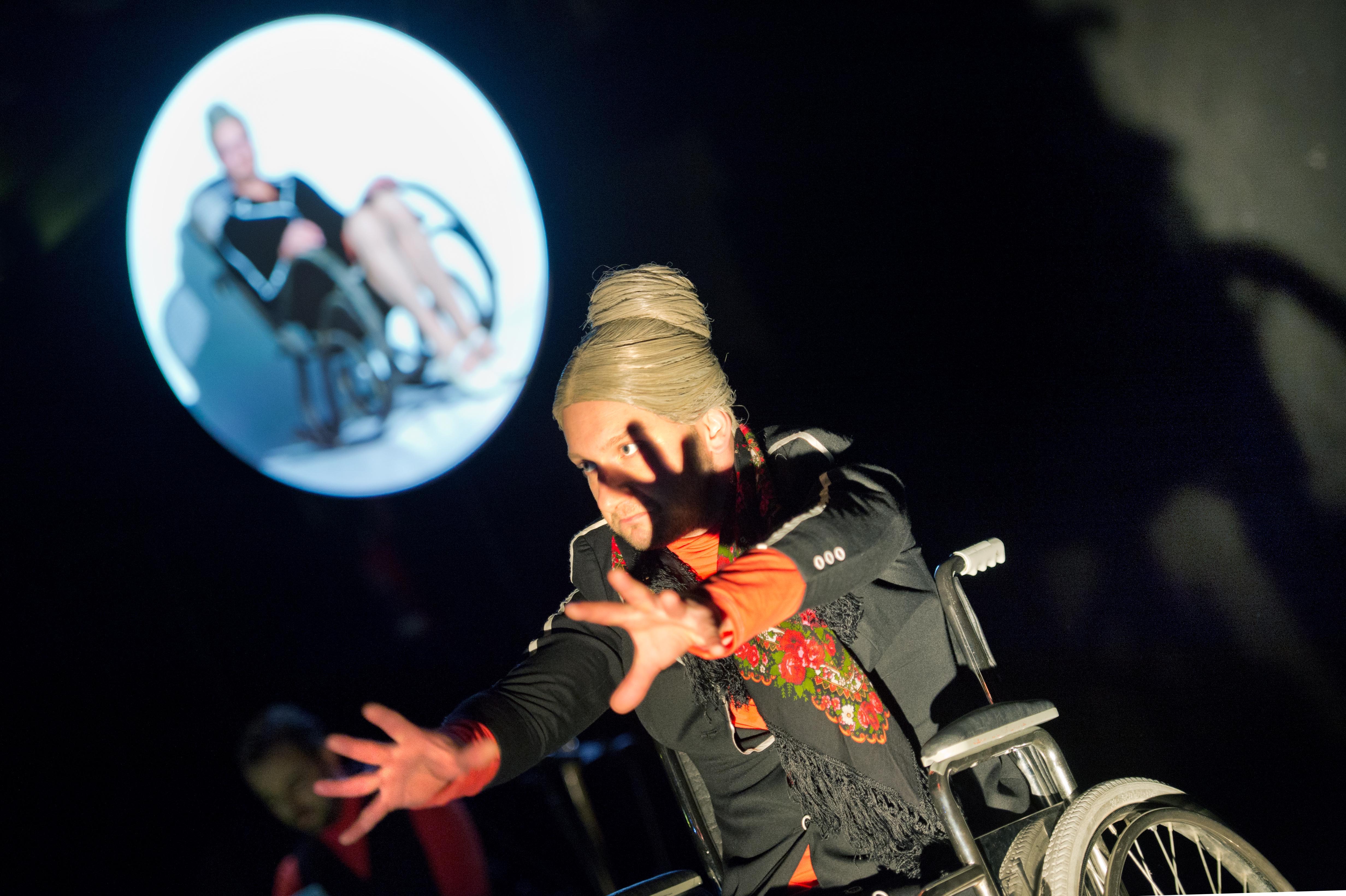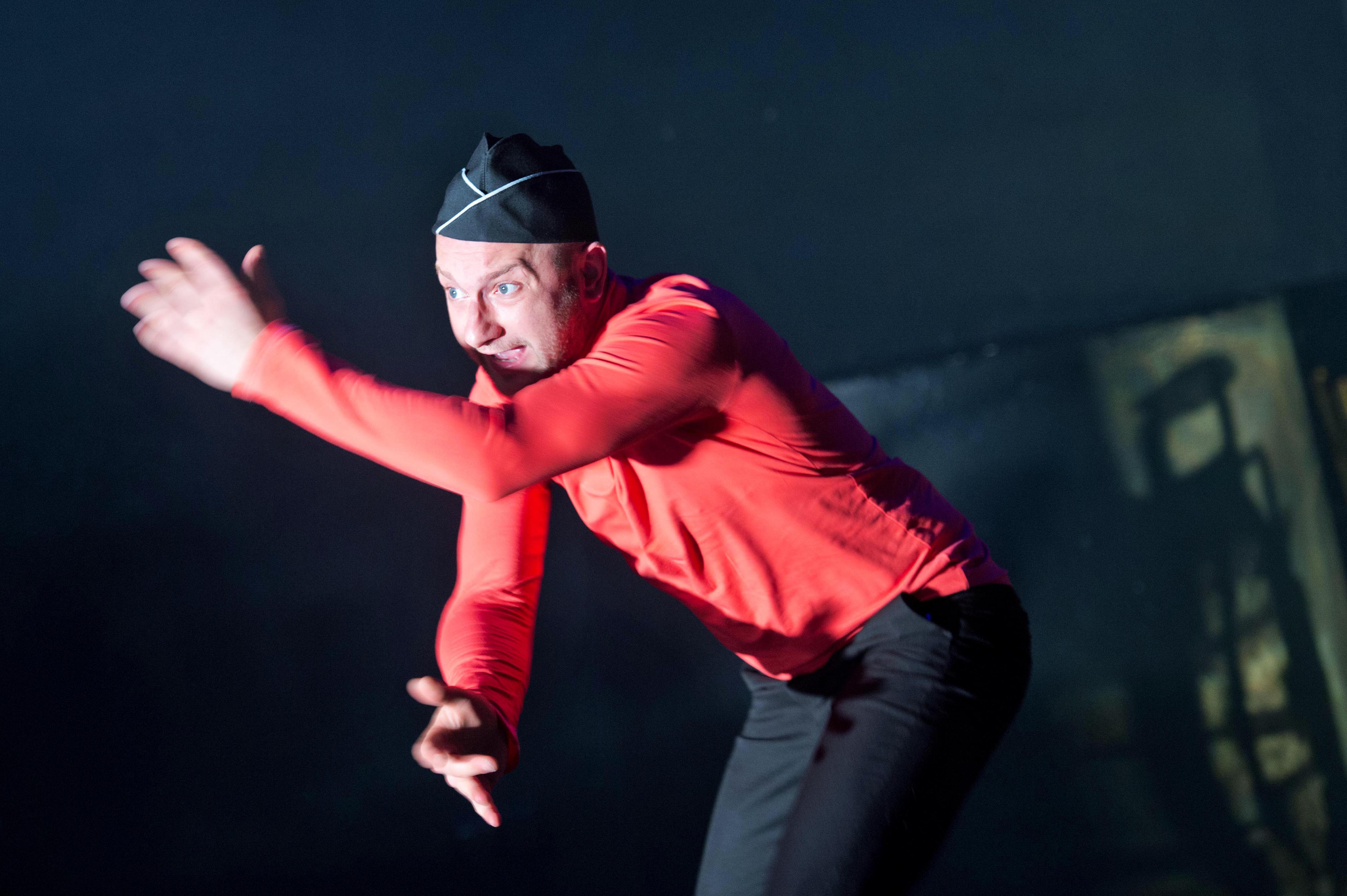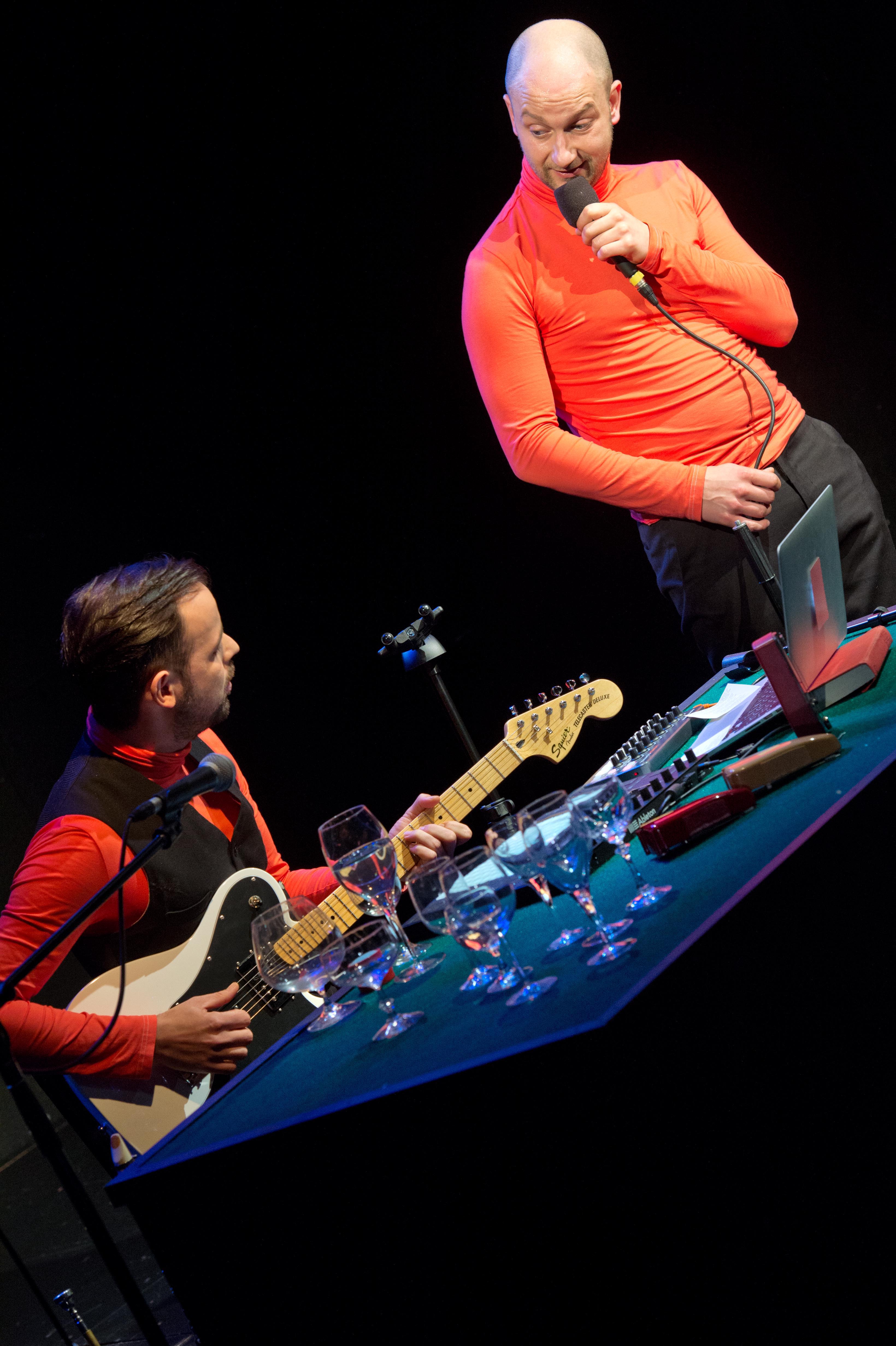 Die Aufführung profitiert sehr von den inhaltlichen „Einsparungen“, da sie mehr Raum für persönliche Interpretationen und Improvisationen des auf der Bühne agierenden Duos Tuschy uns Suske lässt. Ein markanter und wichtiger Teil des Bühnenbildes ist ein Roulette-Tisch und eine Drehscheibte, auf der drei Räume in schwarz, rot und grün platziert sind, in denen Hajo Tuschy in wechselnden Figuren spielt. Gezielte Lichteffekte unterstreichen den Figurenwechsel, außerdem dienen ihm Kostümteile wie Perücken als Hilfsmittel. Jacob Suske verkörpert die Figur des Engländers Mr. Astley, der meist unbeteiligt von der Seite der Bühne auf das Geschehen blickt und erst am Ende in das Geschehen eingreift. Suske spielt Klarinette, Gitarre, Horn und wahlweise dienen ihm auch Gläser oder Metronome als Klangkörper und Instrumente, außerdem singt er. Das alles läuft parallel zur ständigen Bedienung des Mischpultes und des PCs auf der Bühne, über die noch viele weitere Klänge für die Atmosphäre sorgen. Seine Musik bzw. sein Soundtrack zur Inszenierung sind schwer zu beschreiben, mal gibt es sanften Gesang in einem Art Liebeslied für Polina, mal donnernde Fanfaren oder begleitende, meditative Melodien. Alles was Suske an seinem Pult produziert, harmoniert exzellent mit den Texten und Aktionen Tuschys. Der wiederum spielt, wie bereits in COCAINE, gekonnt mit den Grenzen zwischen Realität und Theater – Zuschauer und Schauspieler und damit auch zwischen Suske und Astley, die beide als eine Art Side Kick für Tuschy fungieren, was an einigen Stellen für auflockernden Humor sorgt. In DER SPIELER erlebt das Publikum einen Hajo Tuschy in Höchstform. Er liefert sprachlich und körperlich eine Leistung sondergleichen ab und schafft es, über 90 Minuten eine ungebrochene Spannung aufrecht zu erhalten. Mal ganz davon abgesehen, dass Jacob Suske und Hajo Tuschy auch noch selbst Regie führten, stellt schon die spielerische Leistung der beiden Darsteller ein absolut einzigartiges Können dar.