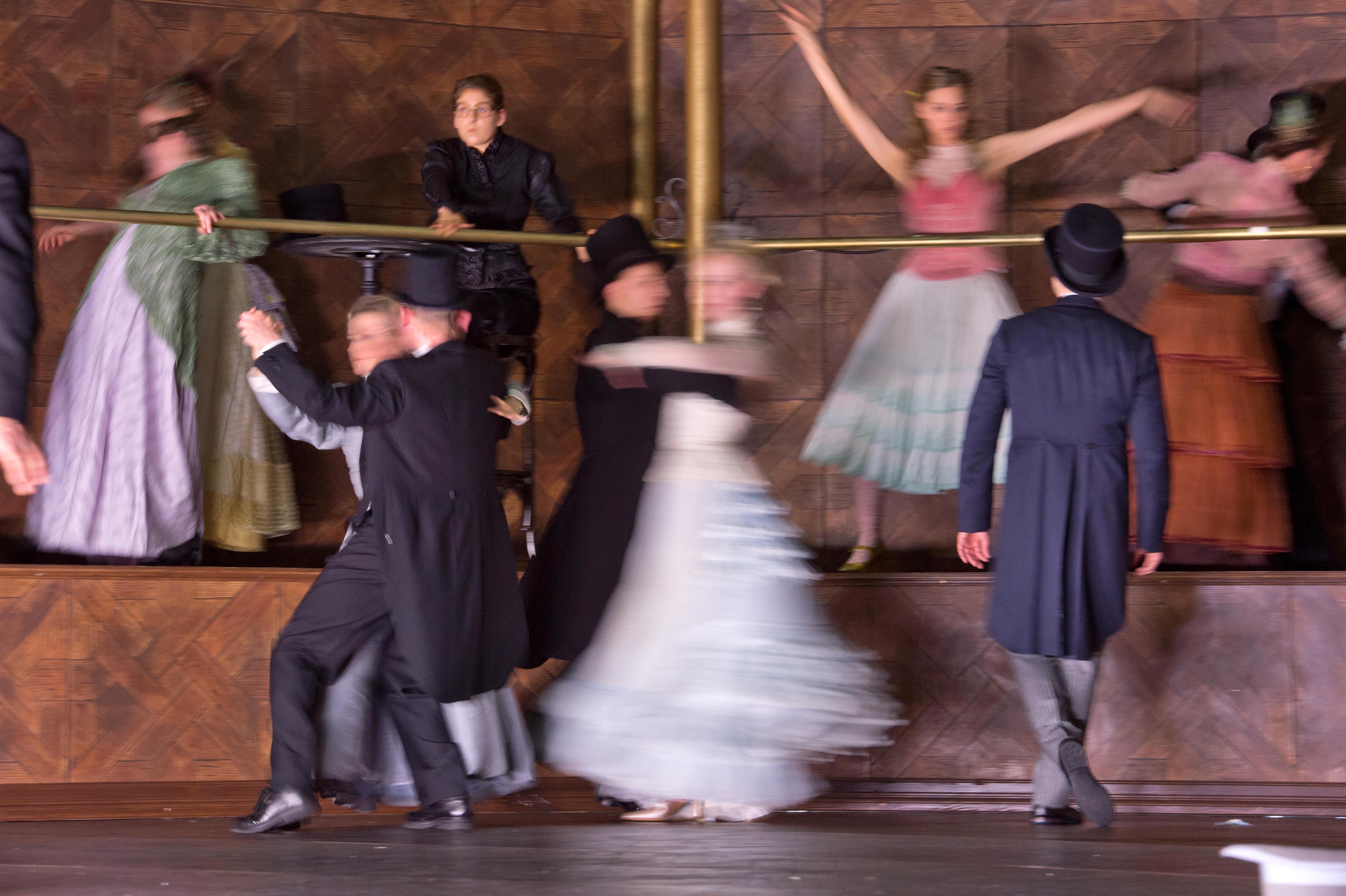 Noch bevor sich der Vorhang öffnet, lernen wir die drei entscheidenden Buddenbrooks bei der Entdeckung ihres Familienbuches kennen: Thomas, Antonie (genannt Tony) und Christian sind die drei Kinder des Konsuls Buddenbrook. Die Familie Buddenbrook ist seit vielen Jahren in Lübeck als anerkannte und erfolgreiche Kaufmannsfamilie bekannt. Ihr Erfolg spiegelt sich in scheinbar dauerhaft stattfindenden opulenten und rauschenden Tanzbällen, sowie im wunderschön eingerichteten buddenbrookschen Saal (Bühne und Kostüme: Sabine Kohlstedt). Doch wie schnell dieses Ansehen vorbei sein kann, zeigt die fast schon prophetische Erzählung eines namenlosen Gastes der Buddenbrooks über die Familie Ratenkamp – mit Einreichung des Bankrotts ist die Familie „passé“. Ironischerweise soll den Buddenbrooks das hier noch belächelte Schicksal bald selbst bevorstehen.