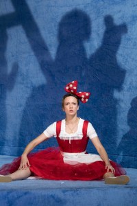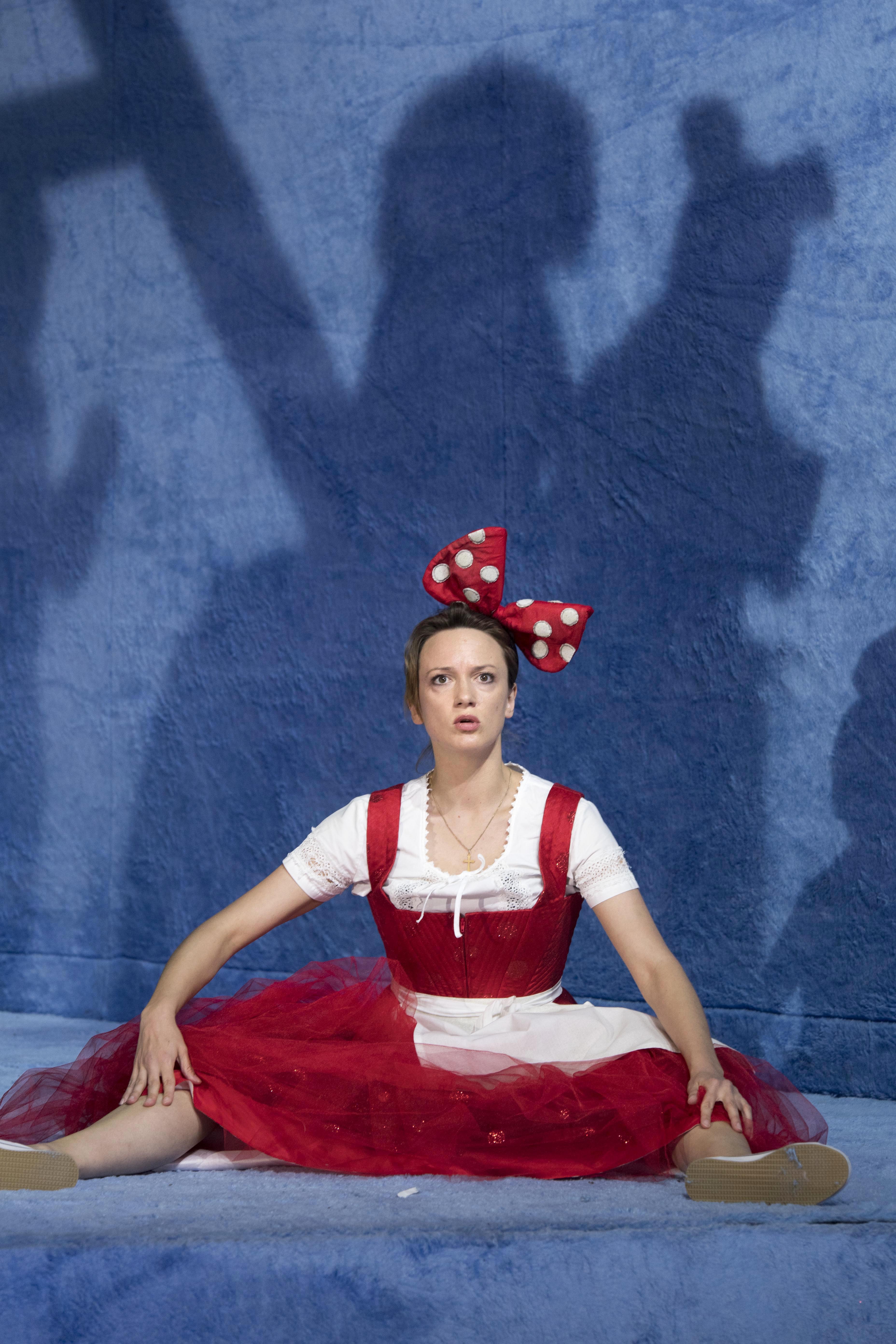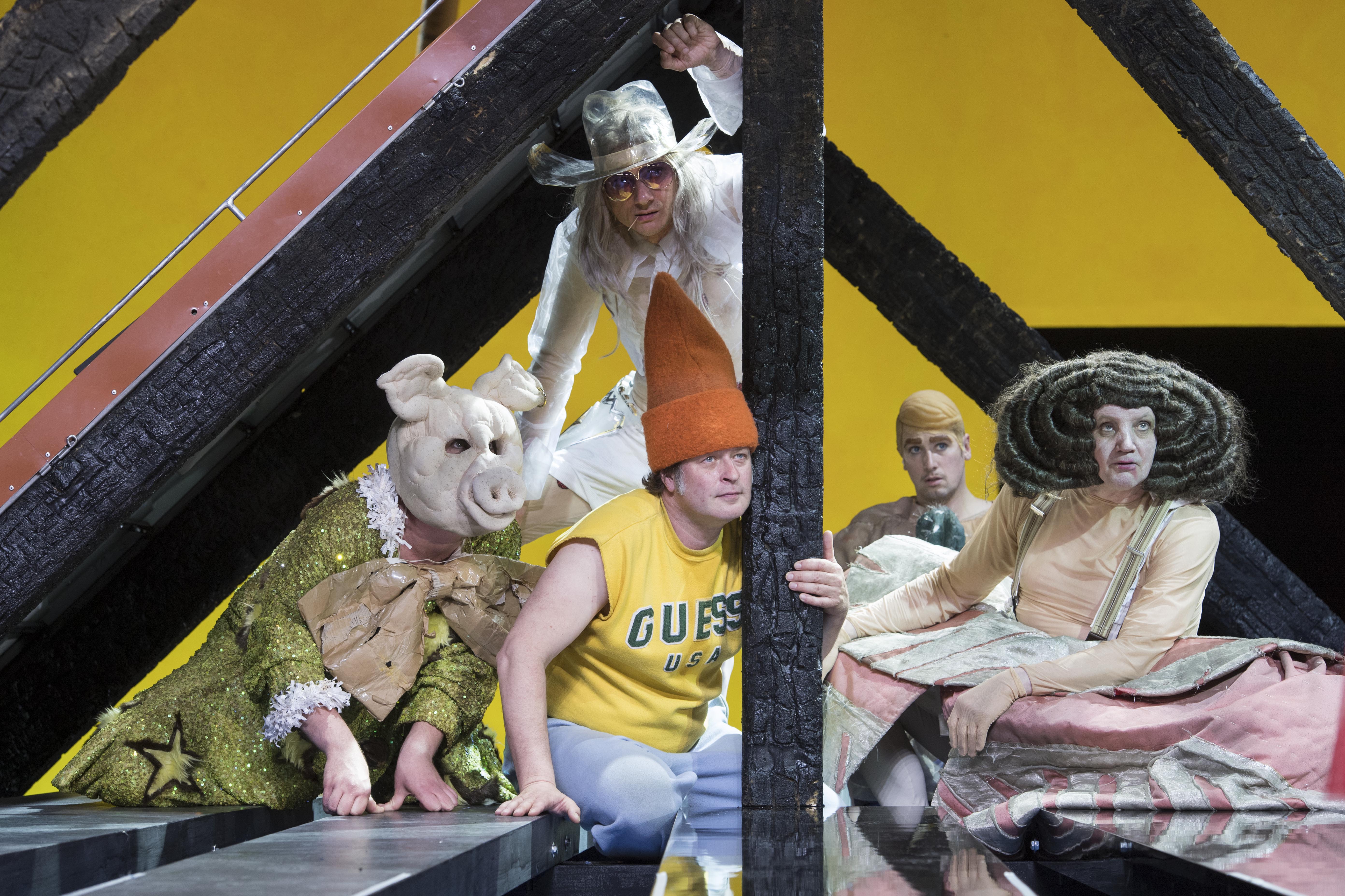 Still, fast unbemerkt kommen endlich nach und nach die Figuren durch den Durchgang über das Dachgestühl bis auf den Steg herausspaziert. Der Schauspieler Sören Wunderlich trägt ein weißes, billig aussehendes Cowboy-Kostüm mit Hut und Sonnenbrille, darunter zeichnen sich mehrere große klaffende Wunden ab. Es folgt Daniel Breitfelder mit falschen Muskeln, falschen Haaren und Plastikschwert; er wirkt wie ein überdimensionaler Conan der Barbar. Anfangs nicht zu erkennen, ist Phillip Basener, der ganz in einen glitzernden grünen Strampler gekleidet ist und eine riesige Fliege sowie eine Schweinsmaske trägt, die er nach Belieben hoch- und runterzieht. Als vorletzter Mann betritt Bernd Braun die Bühne und bildet mit einer der merkwürdigsten Figuren. Sein weites barockes Kleid, am Saum etwas angekokelt, ist hinten offen. Dazu thront eine leicht mitgenommen aussehende Perücke auf seinem Haupt. Holger Kraft tritt als rebellischer Gartenzwerg mit Jogginghose und Zipfelmütze auf – vielleicht spießbürgerlich? Laura Sundermann vervollständigt das Sextett. Als einzige Frau auf der Bühne darf sie unterschiedliche Frauenrollen in verschiedenen roten Kostümen durchspielen, angefangen von der unschuldig-gläubigen Bäuerin bis hin zur taffen Businessfrau.