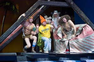Zu Beginn stehen alle Figuren nur nebeneinander im abgebrannten Dachstuhl und blicken umher. Es erinnert etwas an den Beginn von Lessings Nathan der Weise: Auch da brannte ein Haus, nämlich das des Juden Nathan, aus dem seine Adoptivtochter Rahel durch einen Tempelritter, der sich später als ihr verschollener Bruder herausstellt, gerettet wird. Als Zuschauer ist die Frage naheliegend, um wen es sich denn nun bei diesen merkwürdigen, albern-bunt gekleideten Figuren handeln soll (Kostüm: Andy Besuch). Die Frage wird auch in den folgenden anderthalb Stunden nicht beantwortet.
