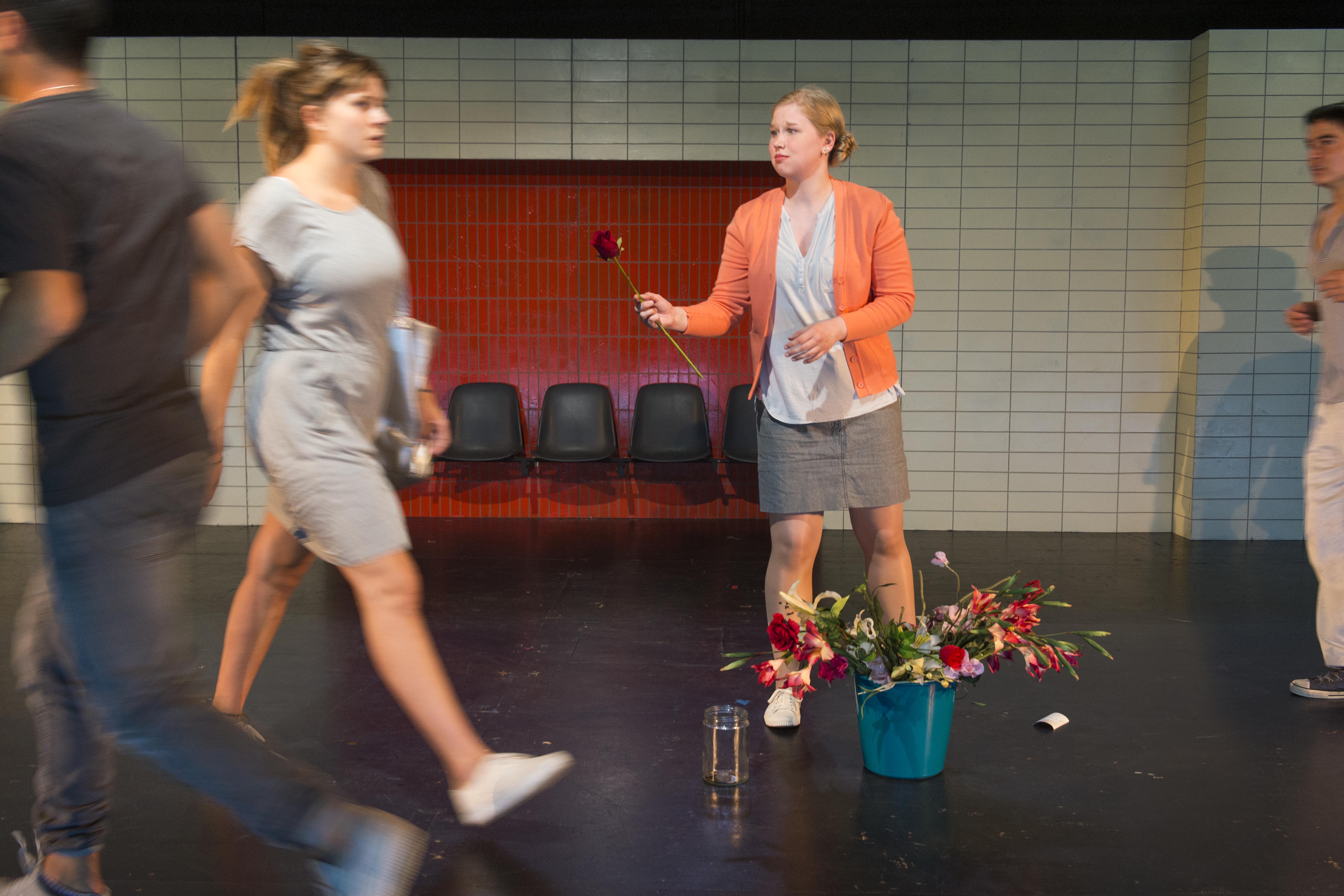 Die Akteure verwandeln sich mehrmals während der Vorstellung hinter einer Trennwand auf der sonst leeren Bühne und schlüpfen in die Haut der unterschiedlichsten Gestalten des monotonen Lebens Während die Jugendlichen in der einen Szene gehetzt auf dem Weg zur Schule ihr Smartphone mit oder ohne Musik nie außer Acht lassen, oder gedankenverloren durch die Straßen der Stadt schlendern, scheinen in anderen Szenen mithilfe dezenter aber wirkungsvoller Requisiten und Kostüme regelrechte Wunder zu geschehen, indem ein blindes Blumenmädchen beispielsweise eine Rose an einen charmanten an Charlie Chaplin erinnernden Gentleman verkauft und dieser sich ein wenig in sie verliebt.