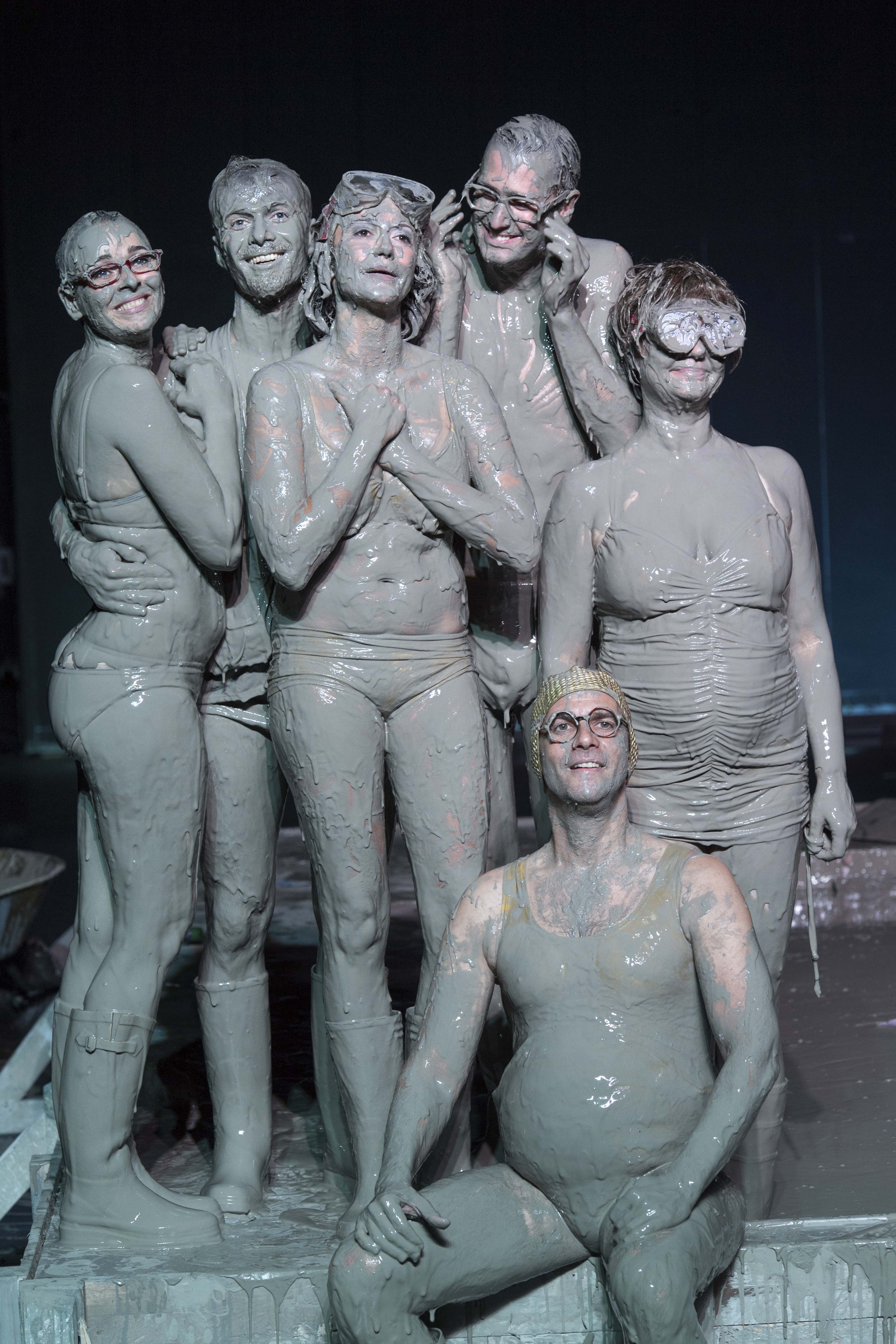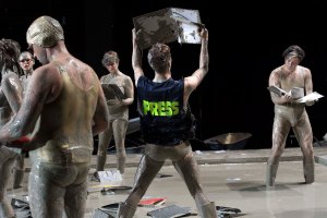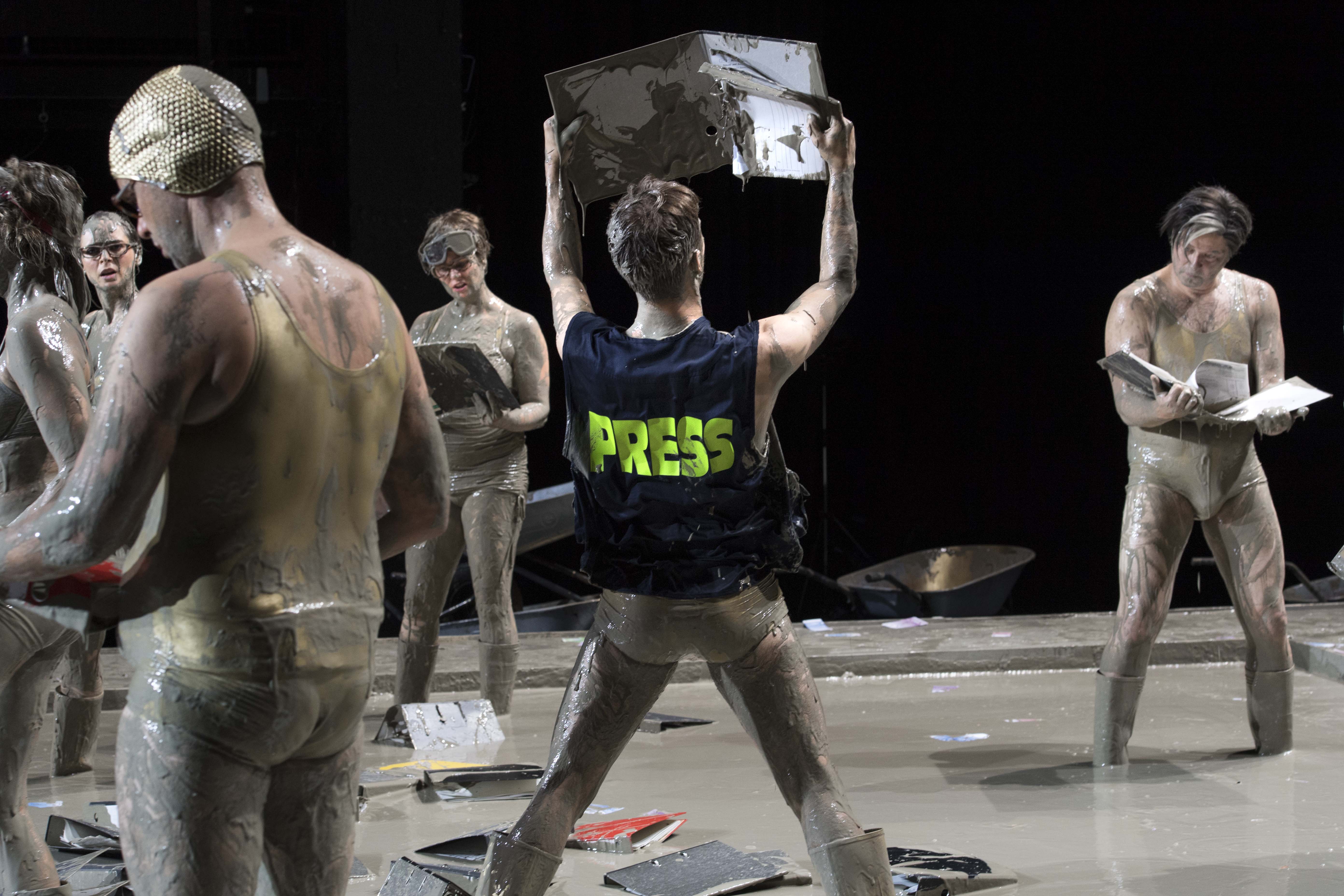 Loesch arbeitet mit einfachen Bühnenbildern, besonders hervorsticht ein Becken, das Fundament des Baus, das mit einer betonähnlichen grau-braunen Masse gefüllt ist und in dem die Schauspieler in Ekstase baden, Aktenordner geschmissen werden, Geldscheine runterregnen, aber auch zum Schauplatz einer Schlammcatch Arena wird, nachdem das Projekt zu scheitern droht und Verantwortliche gesucht werden.