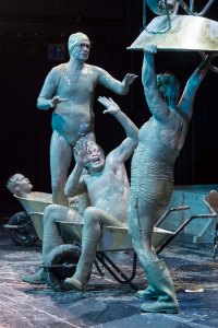 Alle Schauspieler bekleiden übrigens Doppelrollen, so ist Bernd Braun nicht nur der „Ruckherzog“, sonder auch König Midas, der entgegen seines Mythos, nicht verhungerte, weil alles nur noch aus Gold war, sondern jetzt die Stadtführung anstachelt möglichst mehr Geld zusammenzuraffen. Besonders beeindruckend waren vor allem die Darstellungen von Daniel Breifelder und Laura Sundermann in den Rollen der Bürgermeister, aber auch die anderen Ensemblemitglieder haben eine beachtlich konstante und überzeugende Darstellung an diesem Abend gezeigt.