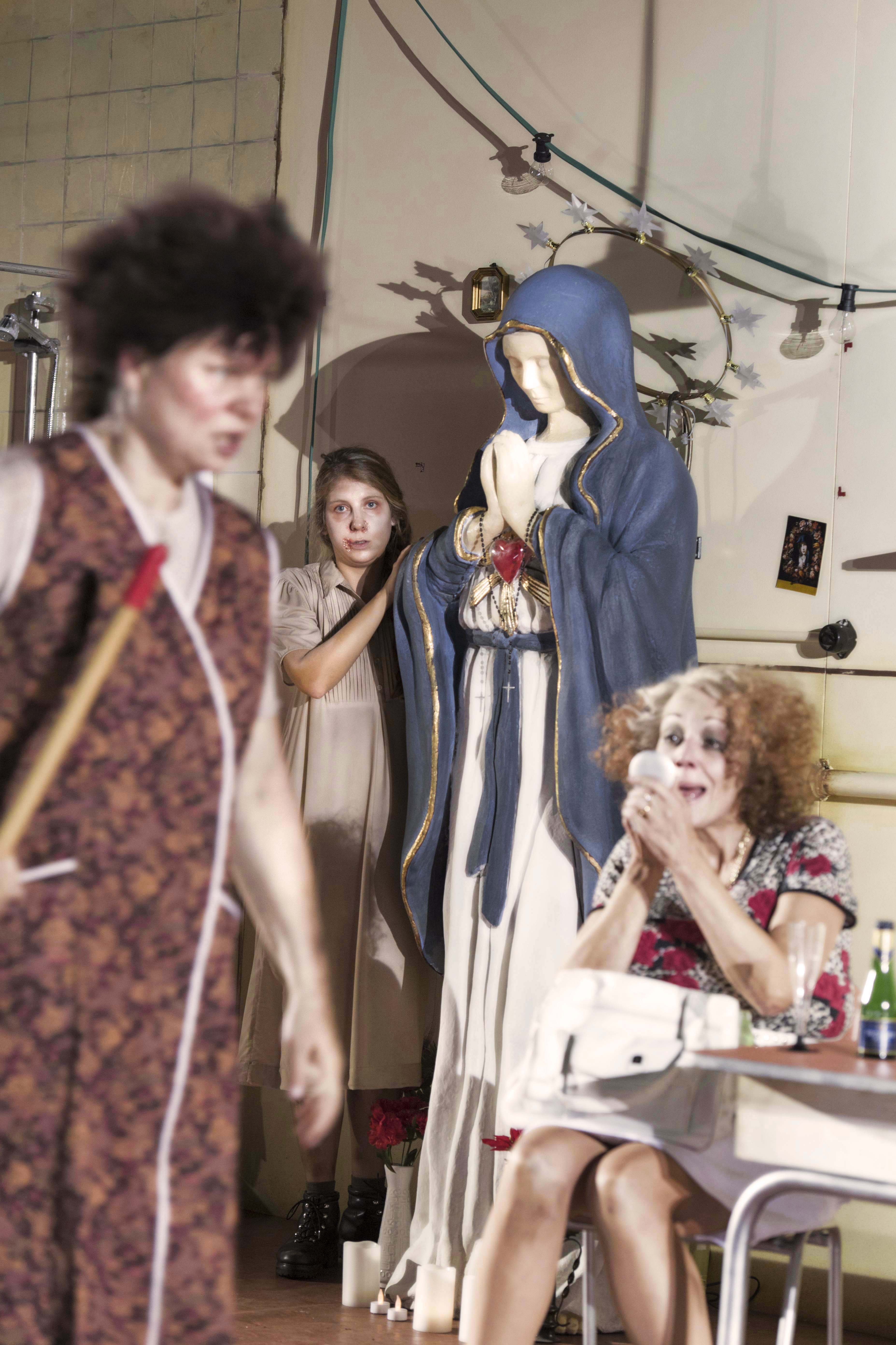 Der Abend lebt von den drei starken Charakteren der einzelnen Frauen, samt ihren Ausprägungen. Fromm sind sie wohl alle auf ihre Art: da gibt es Erna, eine sparsame, fast schon geizige, leicht in die Jahre gekommene Frau, die durch Birte Schrein nicht nur konservativ und kleinbürgerisch dargestellt wird, sondern durch ihre hysterischen Gefühlsausbrüche Platz für einen seelischen Abgrund mit ihren innersten Sehnsüchten erhält. Sie ist eine alleinstehende Frau, die sich von ihrem meistens betrunkenen, zwar sexuell interessierten, aber an Enkelkinder eher uninteressiertem Sohn, nichts mehr wünscht als Letzteres und zudem ständig das Gefühl hat, von ihm enttäuscht zu werden. In ihren Illusionen ist sie es, die den Papst datet, der bei ihr in der Gestalt eines Metzgers auftritt und dieser an ihr ein ernst zu nehmendes, gesittetes Interesse der alten Schule zeigt.
