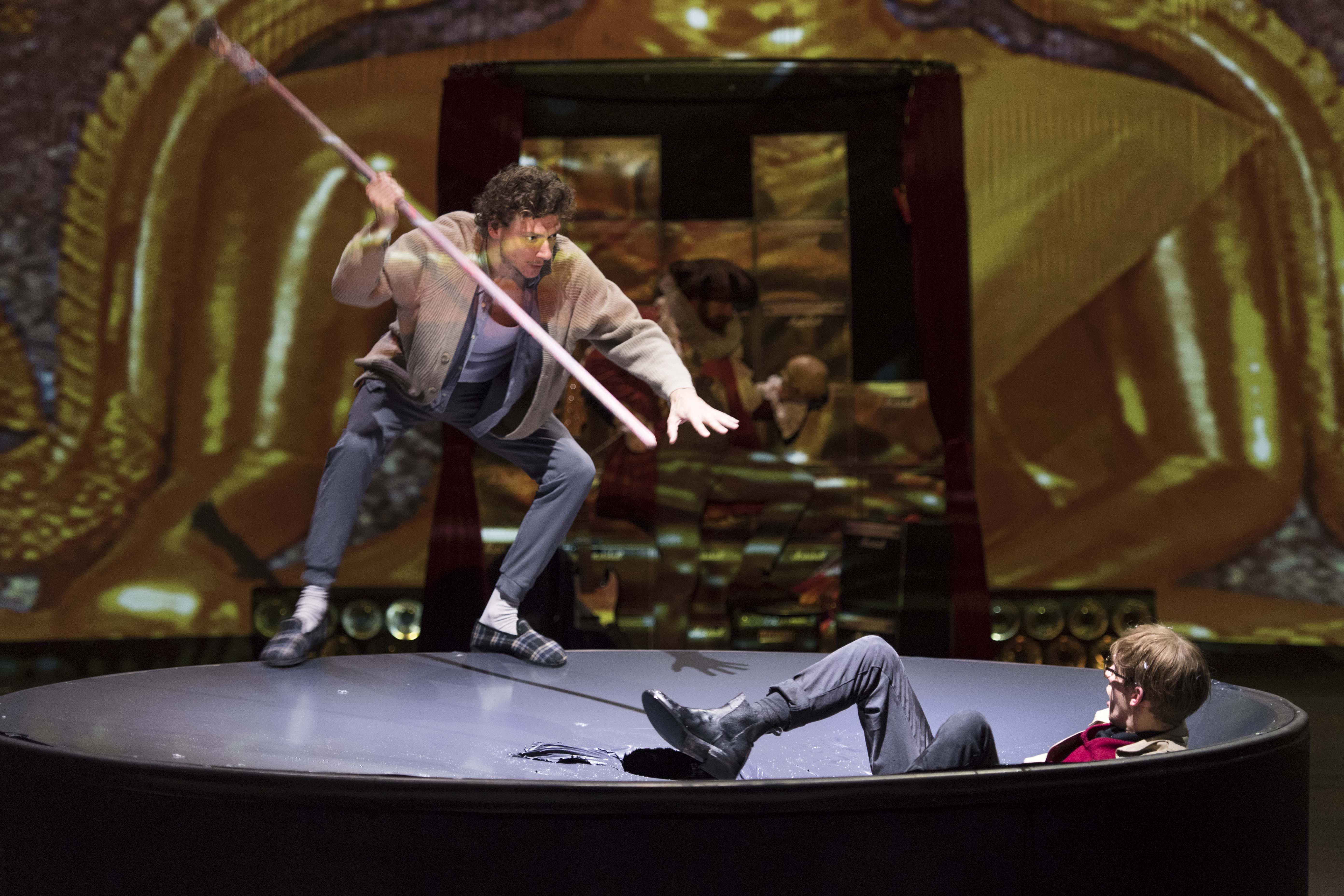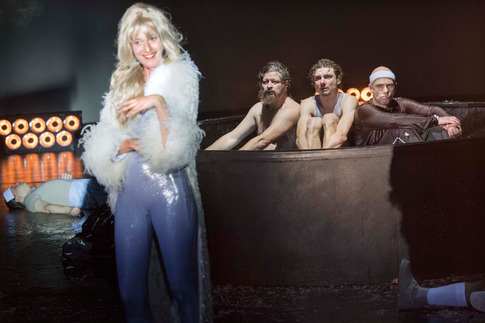 Ähnlich wie bei den Produktionen WOYZECK oder BND – BIG DATA IS WATCHING YOU überrascht auch diese Solberg-Inszenierung mit einem ebenso interessanten wie raffiniertem Bühnenbild (S. Solberg). Um den Konflikt zwischen dem Leben im Inneren der Anstalt und der Abgeschiedenheit von der Außenwelt, der Zwischenebene, der Kontrolle der Irrenärztin und der Außen- bzw. wirklichen Welt möglichst gut darstellen zu können, bespielt das Ensemble gleich drei verschiedene Bühnenebenen. Während der Großteil der Bühne von einer gigantischen, runden Schneekugel, dem Lebensraum der Insassen der Anstalt, in dessen Mitte sich eine Art Teich oder Schwimmbecken befindet, eingenommen wird, sind die Ränder der Bühne der Platz von Fräulein Dr. von Zahnd (Sophie Basse). Thronend auf einem gemütlichen Ledersessel kontrolliert sie nicht nur ihre Patienten, sondern scheint durch zwei oben an der Seite der Bühne installierten Fernseher mit Nachrichten auch noch den Rest der Welt observieren zu wollen.