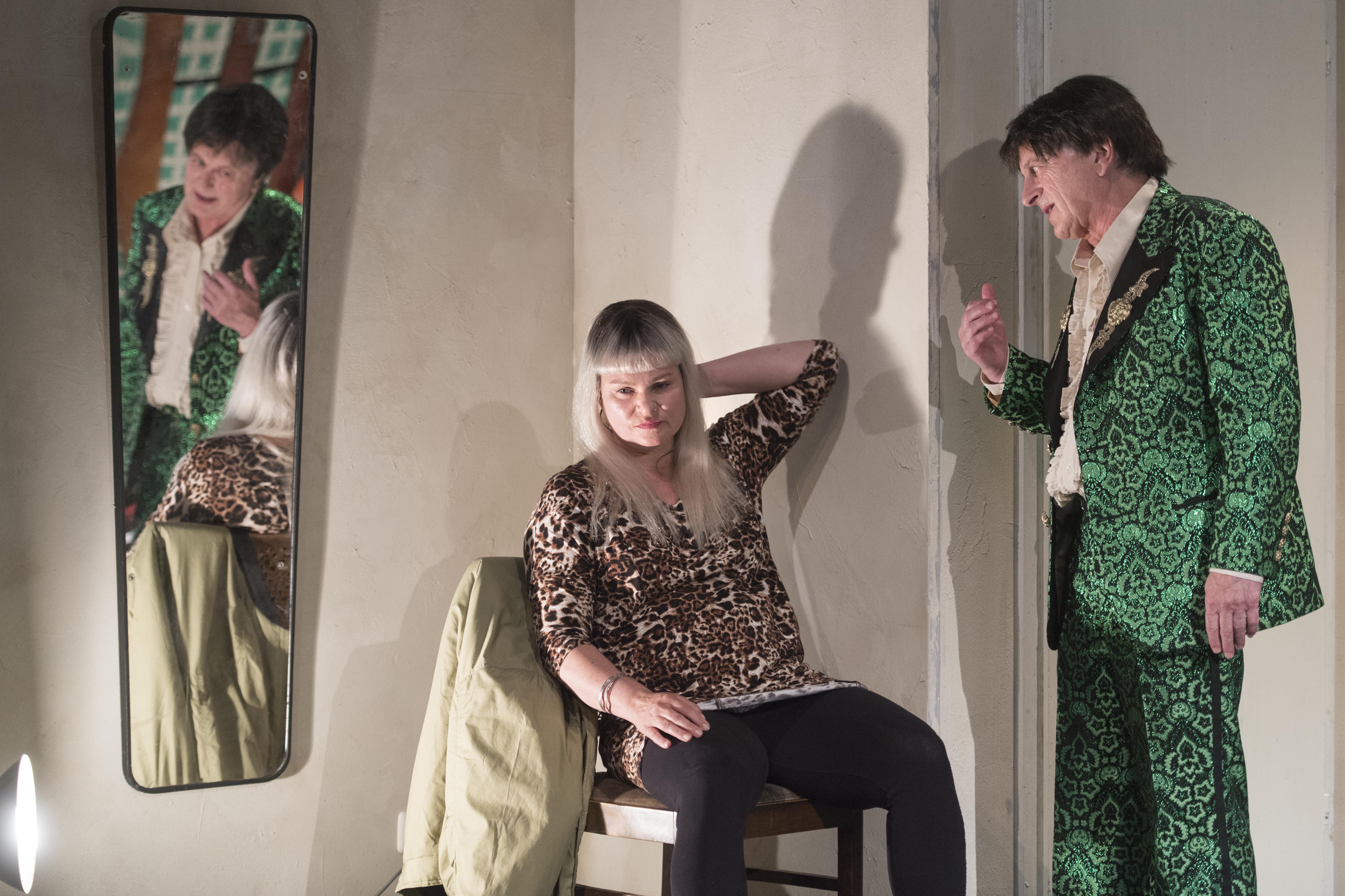 In dieser Kulisse hat Frank Fuller (Klaus Schweizer) seinen großen Auftritt. Mit Toupet und Glitzeranzug à la Weihnachtsbaum wirkt seine Figur wirklich mehr als deplatziert und sorgt direkt am Anfang für einige Lacher im Publikum. Danni (Alois Rheinhardt) erscheint hinter ihm im stilvollen Anzug, gegelten Haaren und Lackschuhen. Claudia (Birte Schrein) präsentiert sich in Leggings, Leo-Kleid, schlecht gefärbten, blonden Haaren und – Zebramorgenmantel. Ihr Sohn Dennis (Manuel Zschunke) kommt in Jogginghose und Hoodie daher. Auch für die Kostüme von Maria Strauch: Daumen hoch! Da passt alles zusammen.