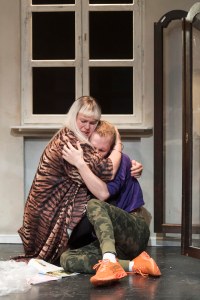 Das Schauspiel beginnt mittendrin. Oben genannte Situation ist genau die Ausgangslage, in der sich der Zuschauer wiederfindet, sobald die Lichter im Saal ausgehen. Staub ist nicht das Einzige, was schon länger in Claudias Wohnzimmer liegen geblieben ist. Auf dem Tisch stapeln sich Chipstüten, Bierflaschen und Kippenreste im übergequillenden Aschenbecher. Die Garnituren von Sofa und Sessel könnten auch eine ausgiebige Reinigung vertragen. Das Licht der Stehlampe ist eher so mittelmäßig, die Tapete zum Davonlaufen. Die Gästetoilette ist links und die Spülung nicht zu überhören. Ebenfalls links ist auch die Treppe zum Obergeschoss und zum Zimmer vom Junior. Die Küche wurde übrigens professionell ausgelagert bzw. „outgesourct“. Durch eine kleine Hintertür auf der rechten Seite geht es zum Freiluft-Küchenzeilen-Erlebnis, inklusive kaltem, scheußlichen Kaffee. Das Tüpfelchen auf dem I befindet sich über der Haustür: der ausgeblichene Schatten eines Kreuzes prangert wie ein Mahnmal über dem Eingangsbereich. Authentischer geht es wirklich nicht; Malte Lübben war zuständig für das Bühnenbild.