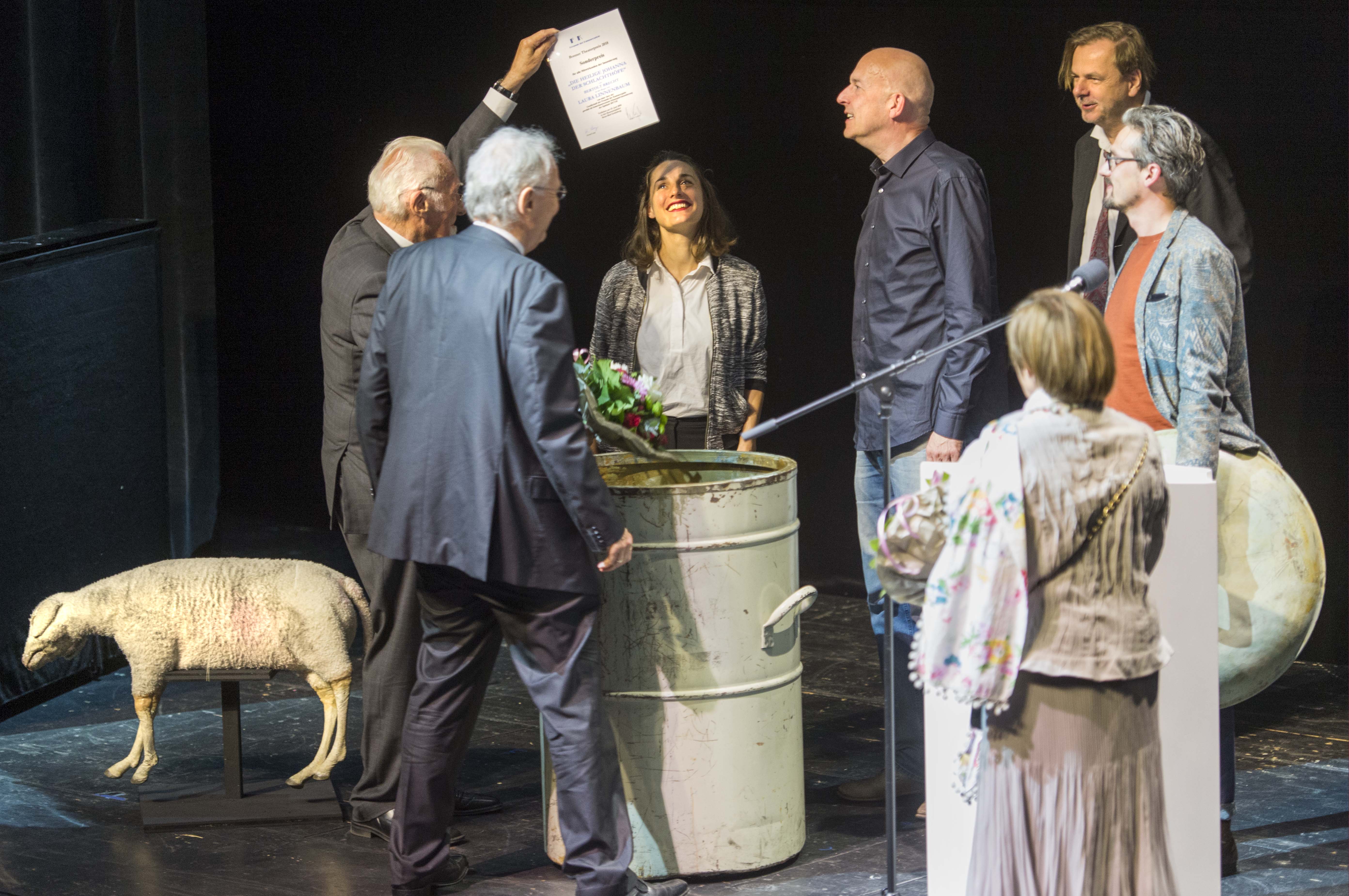 Nach diesen Worten liegt nicht nur Emotionen in der Luft – es wird auch spannend. Prof. Dr. Kurt Tudyka hält die erste Laudatio und gibt die bemerkenswerteste Inszenierung bekannt. DIE HEILIGE JOHANNA DER SCHLACHTHÖFE hat gewonnen. Brechts Politdrama dreht sich um das tödliche Schachspiel des Fleischmarktes. In dessen Mitte befindet sich die junge Johanna Dark, die für das Recht der Fabrikarbeiter kämpft und diesen Kampf letztendlich verliert. Regisseurin war Laura Linnenbaum. Diese konnte leider nicht persönlich den Preis empfangen, hatte aber einen Dankesbrief geschickt, der auch verlesen wurde.