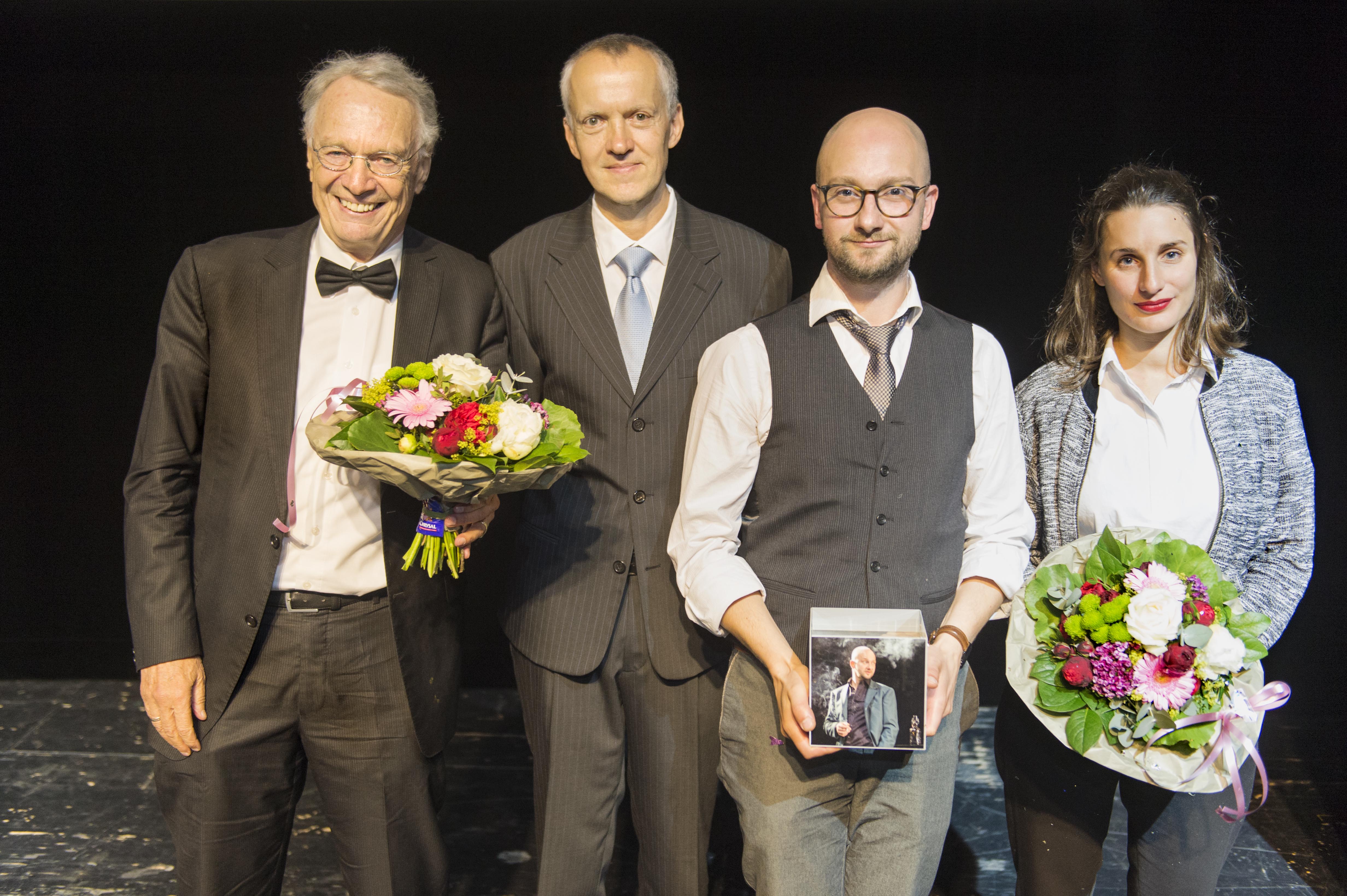 Den letzten Preisträger gibt Elisabeth Einecke-Klövekorn, die auch regelmäßig die Kritiken für den General Anzeiger verfasst, bekannt. Seit 5 Jahren im Ensemble begeisterte Hajo Tuschy das Bonner Publikum und die Kritiker. Bereits nach seiner ersten Spielzeit war der Schauspieler für den Preis nominiert. Er brachte ebenfalls einige Abende am Theater in Eigenregie auf die Bühne: zuletzt inszenierte er zusammen mit Jacob Suske DON QUIJOTE auf der Werkstattbühne. Gemeinsam mit seinen Kollegen Mareike Hein und Daniel Breitfelder organisierte er die Partyreihe „Genießt es, wer weiß, wann es wieder was gibt“ und bildete mit diesen die Formation DIE DREISTIGKEIT. Selbige stehen nun hinter dem Vorhang, springen in Skiklamotten hervor und singen ihrem Kollegen und Freund ein kleines Ständchen. Einer der rührensten Momente. Philip Basener mimt dabei den ja zu ehrenden Tuschy durch eine einfache Maske mit Tuschys Konterfei. Im Anschluss knallen die Konfetti-Kanonen.