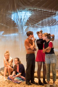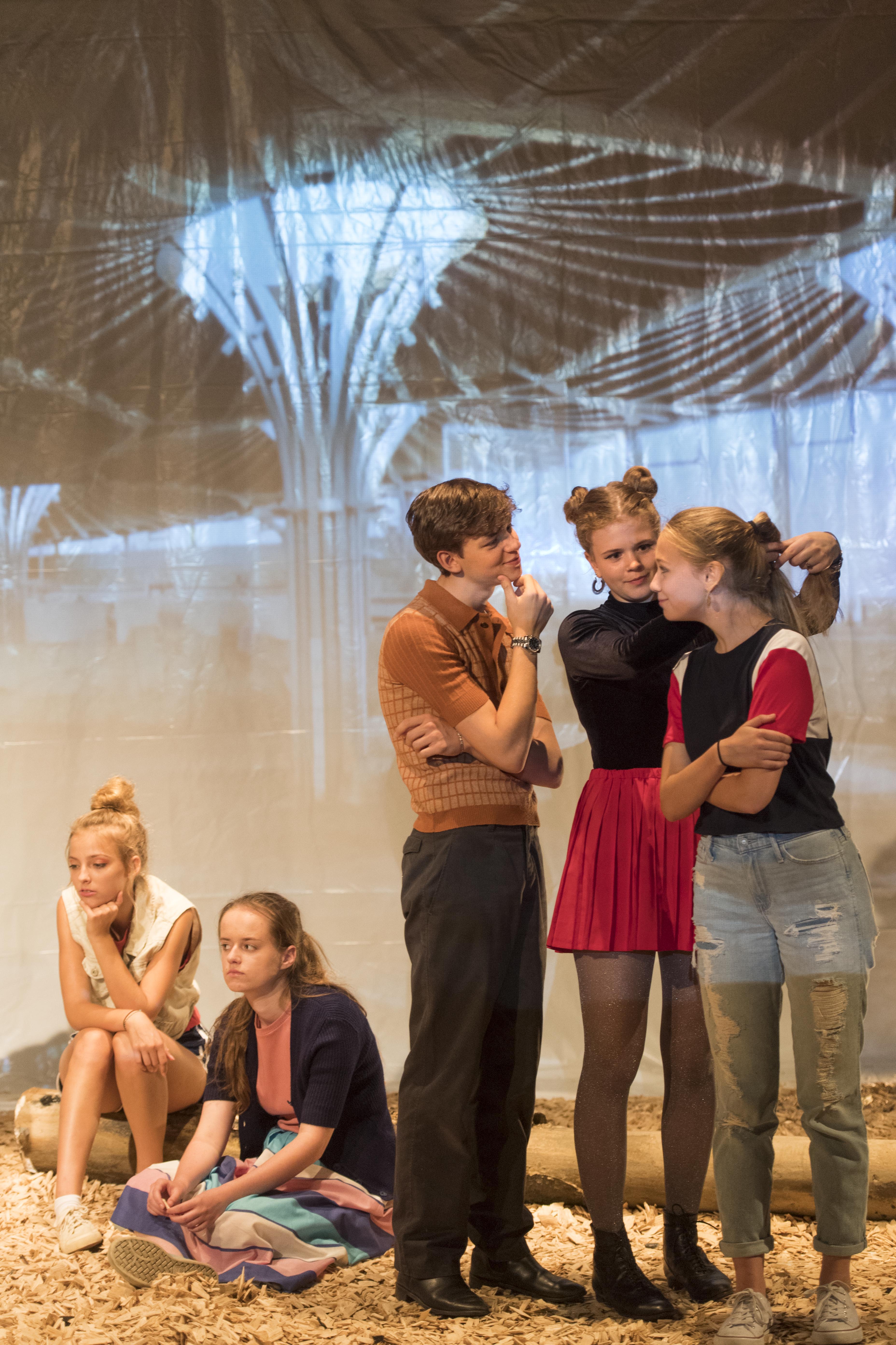 Hier war es ein schöner Kniff der Regie, die Schüler nicht in festen Rollen zu verankern – auch nicht die beiden Protagonisten. Sondern jede Schauspielerin ist einmal Erna und auch die beiden Jungs wechseln sich in den Rollen von Tom und Lorenz ab. Das hat zum Effekt, dass jede/r Schauspieler/in mit ihren Stärken die Figur in einer anderen Emotion zeigen kann und zugleich doch auch eine eigene Figur besitzt, nämlich einen der Klassenkameraden, die das Geschehen akribisch beobachten.