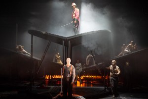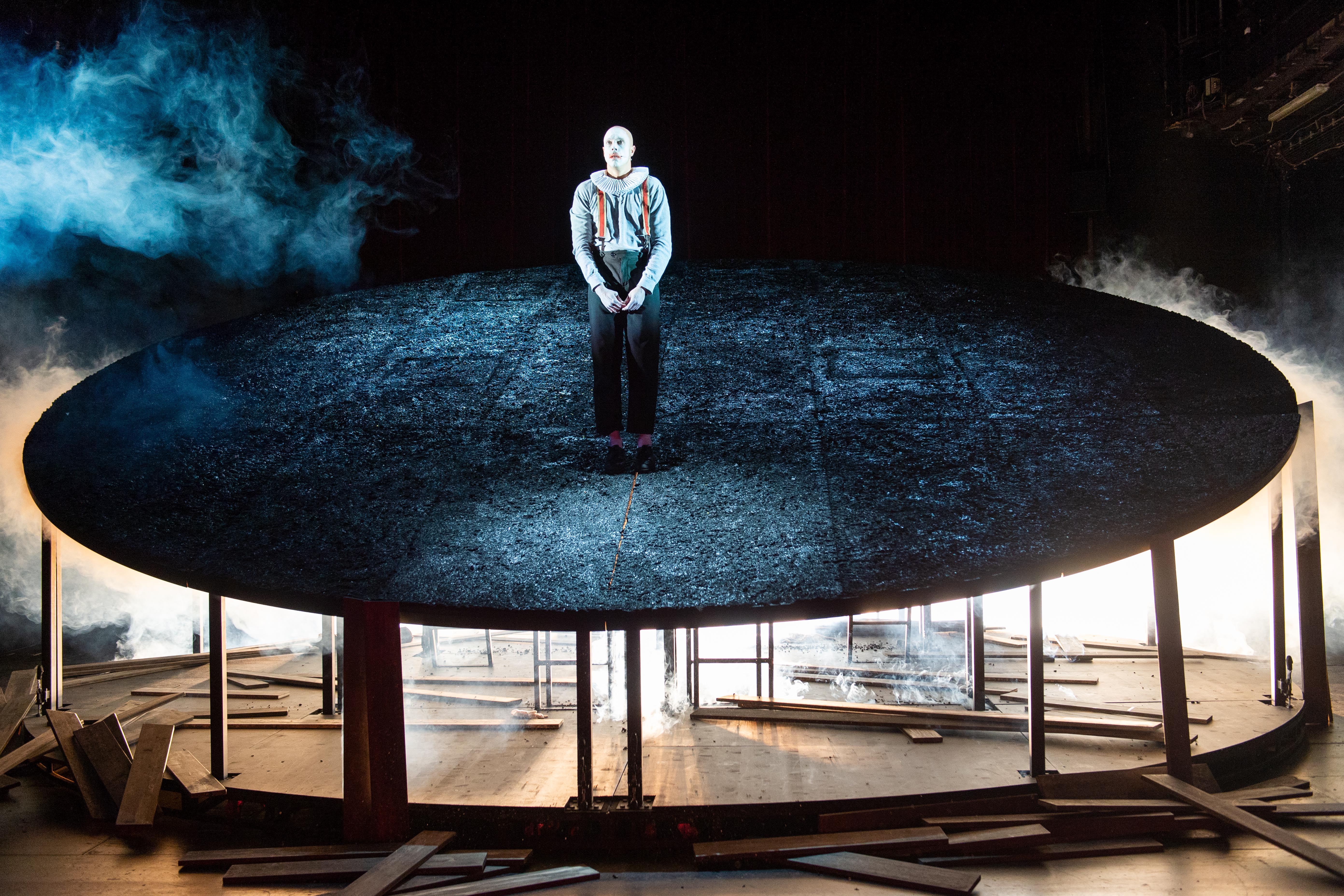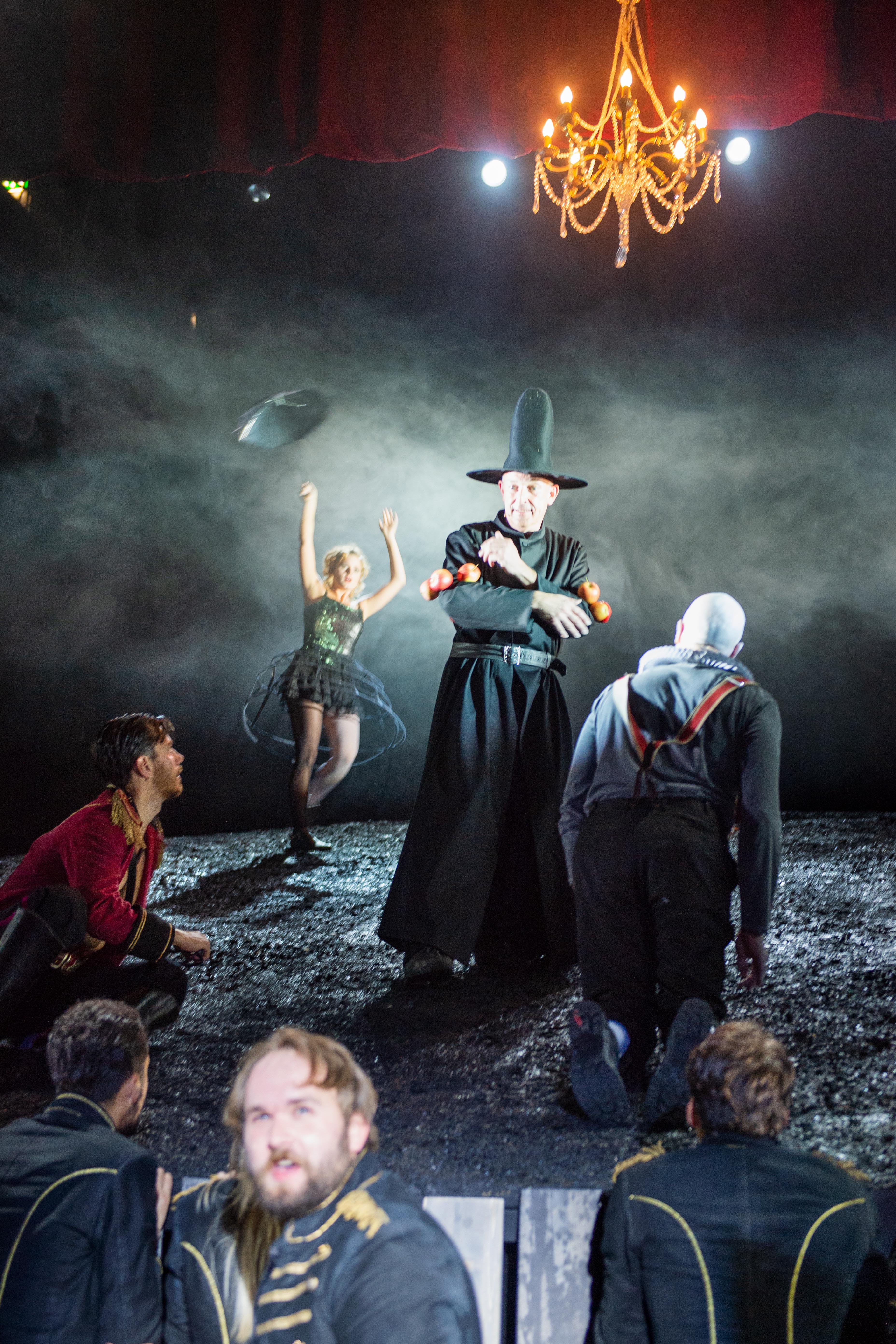 Viel fürs Auge…: Bei der visuellen Gestaltung setze Solberg auf besonders starke Bilder. Die Grundgestalt der Szenerie zu Beginn des Stücks ist eine schiefe Scheibe auf einer Holzhalterung die fast die gesamte Bühne einnimmt. Aus dieser Ausgangslage werden immer wieder neue Bilder gebaut. Aus den einzelnen Teilen der Scheibe entstehen Hausdächer, Bäume und Paläste. In Kombination mit aufwendigen Lichtdesign und -effekten (Sirko Lamprecht) entstehen eindrucksvolle Illusionen: Mal eher farbenfroh und schrill, mal ein zwielichtiges Spiel aus Licht und Schatten. Franziska Harm arbeitete an der Bühne mit und war für die Kostüme verantwortlich. Was die Garderobe der Schauspieler angeht – da ist wirklich alles mit dabei. Von vor Sarkasmus triefenden Fat-Suits, über detailgetreue Uniformen, dreckige Lumpen, halben Clownsgesichtern, Kriegsbemalung und funkelnden Kleidern, bis hin zu langen Mänteln und Hexenhüten. Wie gesagt, viel fürs Auge in jeglicher Hinsicht. Beeindruckend, Daumen hoch!