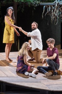 Oberon und sein untertäniger Lehrling Puck (Alois Reinhardt) versuchen daher, mit dem Saft einer Wunderblume die Menschen Lysander (Gustav Schmidt) mit Helena (Sandrine Zenner), und Hermia (Annina Euling) mit Demetrius (Timo Kählert) zusammenzubringen. Puck wird damit beauftragt, während sich Oberon selber darum kümmern möchte, Titania mit der Blume zu verzaubern. Im Endeffekt geht nur leider alles schief, was schief gehen kann: Lysander verliebt sich in Hermia statt in Helena, Titania in einen ihrer Elfen, nur Demetrius erwacht und ist unsterblich in Hermia verliebt, so wie beabsichtigt. Allerdings führt die Anbetung der beiden Männer nur dazu, dass sich Hermia verspottet fühlt und keinen von beiden mehr haben möchte. Sprich, es ist keinem geholfen. Als Puck und Oberon das bemerken, ist der Schlamassel schon groß. Letztendlich gelingt es allerdings noch alles wieder in die richtigen Bahnen zu lenken, sodass am Ende drei Hochzeiten gefeiert werden können.