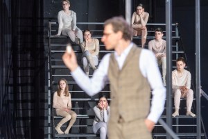 Dass die Jugendlichen eine solche Energie auf die Bühne bringen, mag aber nicht zuletzt an der intensiven Vorbereitung liegen, die schon Mitte Januar begonnen hatte. In den ersten Monaten traf sich die Gruppe regelmäßig an Samstagen und diskutierte auf Grundlage des Romans über wichtige gesellschaftliche, aber auch zwischenmenschliche Probleme. Es wurde viel über Gott, den Klimawandel, Wahrheit und Wirklichkeit, populistische Politik von damals aber auch von heute geredet und besprochen, welche kritischen Aspekte des Romans die Jugendlichen überhaupt beschäftigen. Aus dieser Workshop- und Probenphase gehen wohl auch einige Szenen hervor, die an Übungen aus dem theaterpädagogischen Bereich erinnern. Der Regisseur Dominic Friedel erhielt hierfür tatkräftige Unterstützung von einer neuen Theaterpädagogin am Theater Bonn, Susanne Röskens, die viel zur wunderbaren Gruppendynamik beigetragen hat. Eine dieser durch Übungen inspirierten Szenen findet sich gleich zu Beginn des Stücks: sehr eindrucksvoll lassen die Schüler Zisch- und Fauch-Laute sowie zum Teil geflüsterte Sätze zu einem bedrohlichen Klangteppich werden lassen, dessen Wirkung man sich nicht entziehen kann. Wie viel Wert auf den Gruppenzusammenhalt und die Individualität des einzelnen gelegt wurde, lässt sich auch aus der Selbstverständlichkeit herauslesen, mit der die Jugendlichen die Bühne betreten.