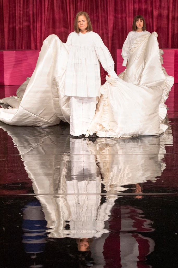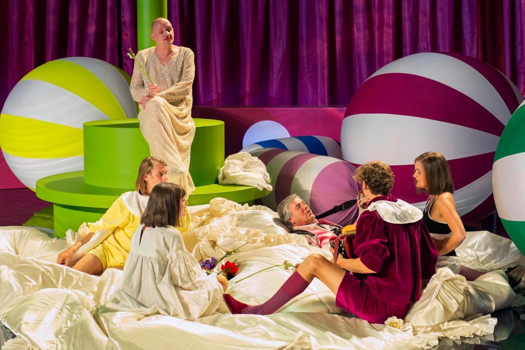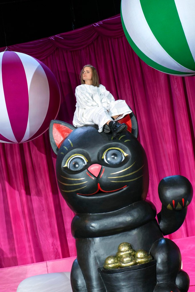 Charlotte Sprengers Inszenierung hat drei große Schwerpunkte: der wohl nur wenig gekürzte Text, die Kontraste zwischen der bunten Traumwelt und der grauen Realität, die durch eine graue Wand am Anfang und Ende den Traum in seine Schranken weist und der Witz, der einem Lustspiel innewohnen soll. Letzterer ist reichlich vorhanden, manchmal vielleicht etwas zu viel, denn es ist alles schon bunt und trotzdem schwelt im Hintergrund noch diese Gesellschaftskritik, die aber in Lessings Sprache nicht immer leicht zu erfassen ist. Es gibt ruhige Momente, in denen vor allem die Gefühlswelten der Figuren in traumhaften Szenen dargestellt werden, z. B. als Franciska verliebt mit Werner fangen spielt oder lächelnde Flauschebälle auf Rollschuhen um Minna und Franciska fahren. Leider wirken diese Szenen manchmal etwas zu lang, sodass man aus dem Handlungsfluss geworfen wird. Überhaupt kann sich in dem 2,5 stündigen Abend doch der ein oder andere lange Atem als nützlich erweisen. Es ist allerdings Lessing anzukreiden, dass sich die Handlung wirklich nur mühsam entwickelt, eben weil er so viele Umwege zwischen den Figuren eingebaut hat, die bei einer Textanalyse sicher sehr spannend, zum Sehen allerdings etwas anstrengend sein können. Dennoch ist es positiv zu bewerten, dass möglichst viel Text beibehalten wurde (Dramaturgie: Nadja Groß) und keines der vielen Themen allzu viel in den Vordergrund gerückt oder vollständig weggelassen wurde. Das kann kritisiert werden, oder man freut sich, dass so die Vielfältigkeit des Stückes gezeigt wurde, wenn auch nicht auf die heutige Zeit hin interpretiert.