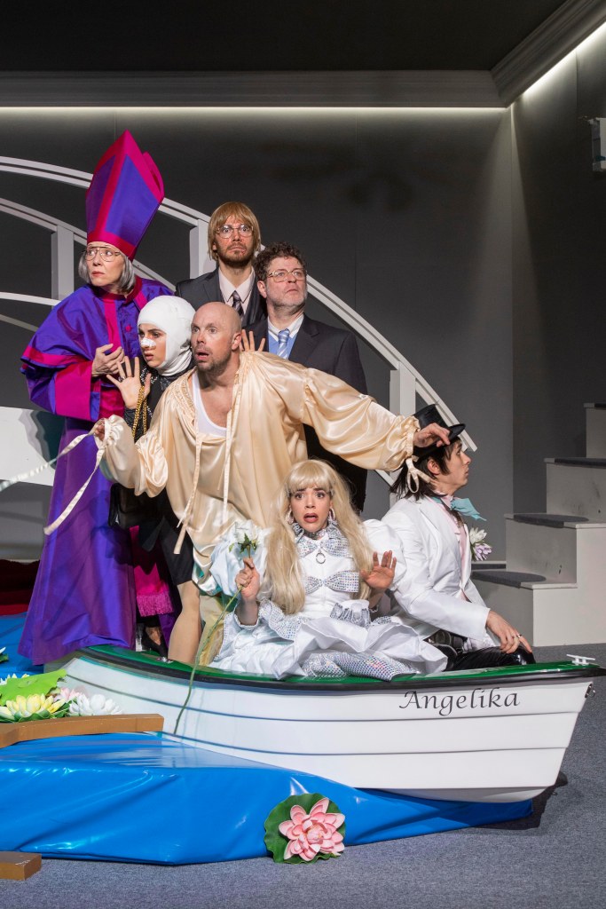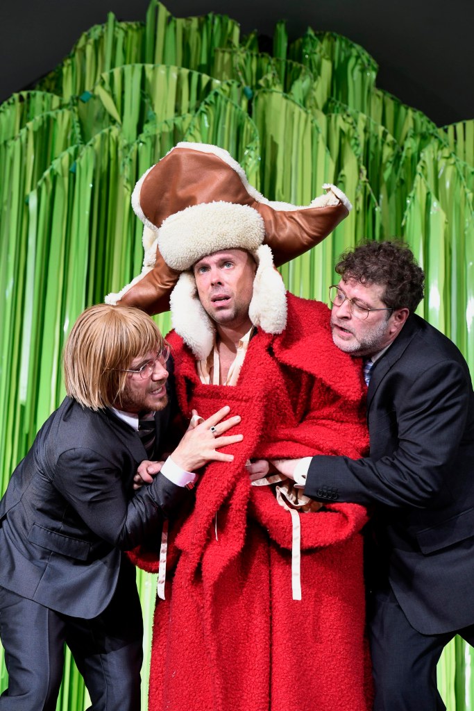Bei dieser Aufführung geht es aber vor allem nicht um die Handlung, sondern um die Darstellung der dieser als Komödie. Daniel Stock gelingt es mit der Hauptrolle gleichzeitig sich glaubwürdig der Hypochondrie zu ergeben, als auch mit dem deutschen Comedy-Fernsehen bekannten Sarkasmus Lacher zu erzeugen. Wirklich Dynamik bringt aber erst Sandrine Zenner mit der trotz ihrer hohen Präsenz auf der Bühne durchgehend überzeugenden Darstellung der Toinette ins Spiel. Die anfangs recht schwerfälligen Slapstick-Elemente fügen sich über den Abend ein und große (gewollt chaotische) Szenen mit vielen gemeinsamen Akteuren gelingen, ohne vollständig ihr ihrer Komik unterzugehen. Etwas unklar bleibt während der gesamten Aufführung die Rolle der Flötistin Mona Raab. Sie ist nicht (wesentlich) in die Handlung eingebunden und Lacher kann sie nur als Projektionsfläche für die Cholerik des eingebildeten Kranken hervorlocken.