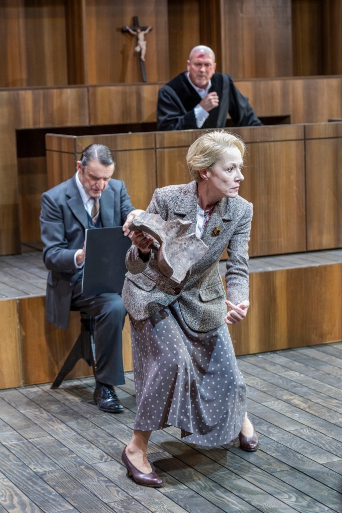 Ob es wegen Corona ist oder weil die Zuschauer*innen, nachdem der Vorhang aufgeht, direkt vor einem Gerichtssaal aus meterhohen Holzwänden, die das Bonner Wappen krönt (Bühne und Kostüme: Tom Musch) sitzen, bleibt offen. Die anfängliche Ehrfurcht gebietende Atmosphäre wird jedoch schnell durch den jammernden Richter Adam (Klaus Zmorek) und seinen Gerichtschreiber Licht (Wolfgang Rüter) aufgelockert. Dem Richter scheint in der letzten Nacht einiges passiert zu sein, da er zwei dicke Wunden am Kopf hat und zudem seine Perücke fehlt, die er angeblich entsorgen musste, weil eine Katze in ihr ihre Jungen bekommen hätte. Die Geschichte ist sehr abstrus und auch Licht mag dem ganzen fast nicht trauen, aber er wagt es natürlich auch nicht, seinem Vorgesetzten zu widersprechen. Als sich dann auch noch unerwartet die Frau Gerichtsrätin Walter (Merle Wasmuth) zu einer Inspektion ankündigt, bricht bei Richter Adam das Unbehagen aus. Schließlich ist Gerichtstag und draußen wartet schon eine ganze Meute an Klägern. Zu seinem Unglück besteht die Frau Gerichtsrätin nach ihrer Ankunft auch darauf, dass diese angehört und verhandelt werden.