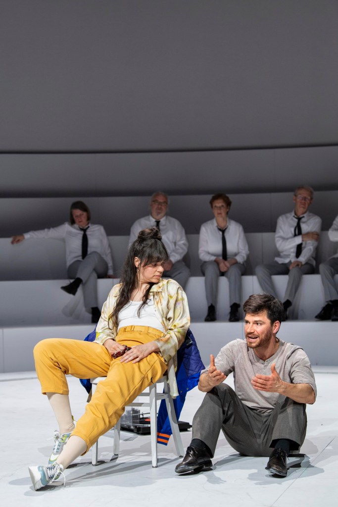 Ohne Frage war es ein spannender Abend. Martin Nimz konzentrierte sich bei seiner Inszenierung auf die ältere Fassung des Stücks, sodass er einen sechs-stimmigen Chor satt eines Anwalts, wie es in der überarbeiteten Fassung steht, in das Spiel intergiert. Der Chor interpretiert und ermöglicht Einblicke in die Psyche der Protagonisten, irritierte die Zuschauer jedoch durch die Zerstückelung des Textes.Statt am Geschehen teilzunehmen, beobachtet und kommentiert der Chor die Geschichte wie in einer antiken Tragödie. Dennoch baut Nimz ihn geschickt in die einzelnen Szenenbilder ein, umdie angespannte Stimmung zu unterstreichen und den Zuschauer zum Nachdenken zu animieren.