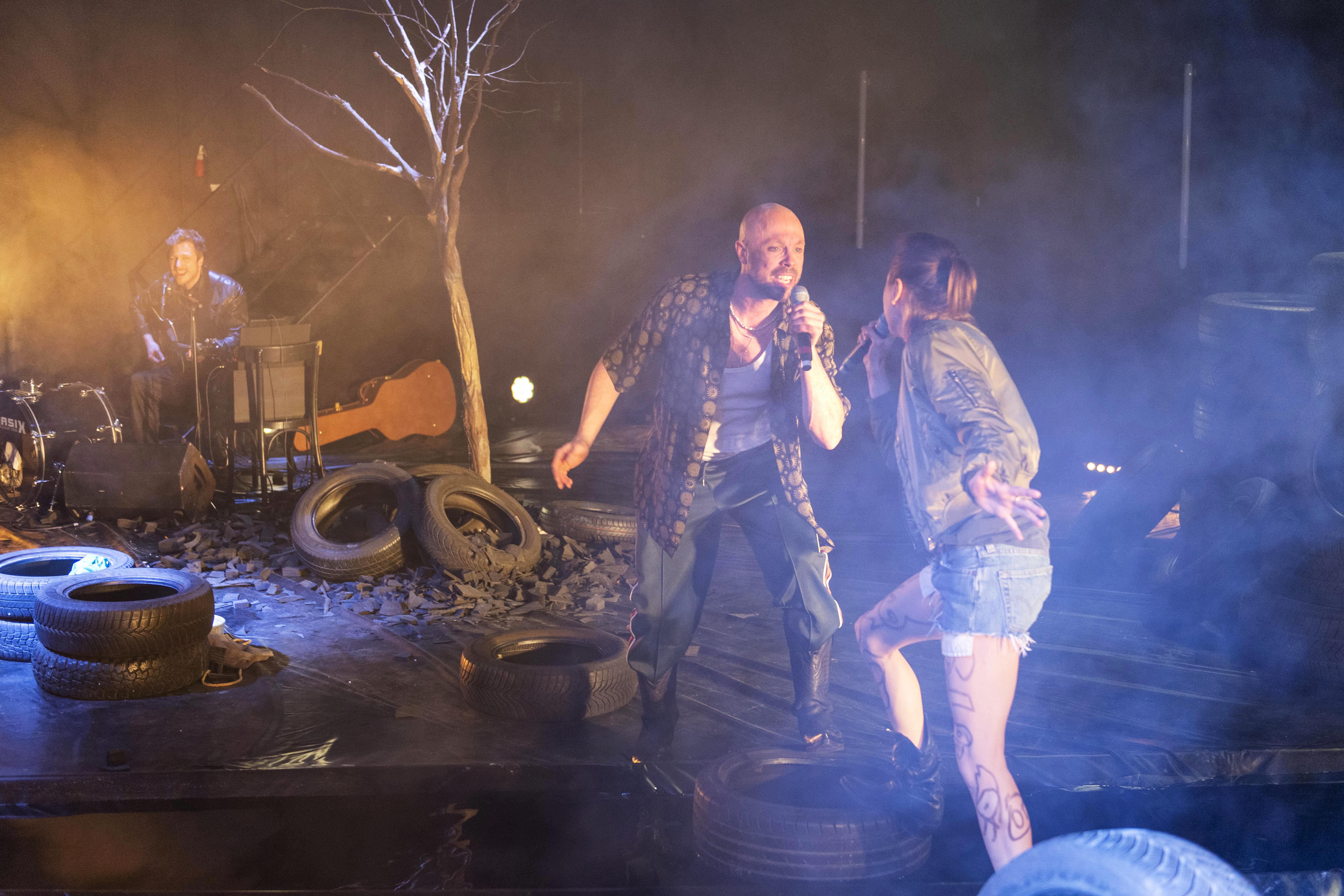 Hausregisseur Simon Solberg hat eine ungewohnt zurückhaltende Inszenierung auf die kleine Werkstattbühne gebracht. Das beginnt schon beim Bühnenbild, das er ebenfalls gestaltet hat: Da Didier und Elise ihr eigenes „kleines Amerika“ gründen wollen, gestalten sie das Stück Land nach ihren Vorstellungen. Da stehen also zwei blattlose Bäume, eine Menge Autoreifen, die beiden Mikrofonständer und natürlich der Musiker Philip Breidenbach im Hintergrund. Mehr braucht es nicht. Oder doch – einen kleinen Bach, der an den Fluss Jordan aus dem berühmten Song von Johnny Cash „Wayfaring Stranger“ erinnern soll und ähnlich wie der Hades das Land der Lebenden und Toten trennt. So wirkt auch die Inszenierung wie die zwei Seiten derselben Medaille. In der ersten Hälfte wird alles etwas überzeichnet bunt, fröhlich und lustig dargestellt, sodass selbst die überhaupt nicht schöne Kindheit der Protagonisten irgendwie witzig ist. Der Bruch erfolgt dann schlagartig mit der Erkrankung Maybelles. Nun muten alle Albernheiten gezwungen an und die Verzweiflung angesichts der endlosen Untersuchungen, die keine Hilfe oder wenigstens Linderung für Maybelle schaffen, bricht sich immer wieder ihre Bahn. Hier gewinnt die Inszenierung deutlich an Stärke. Es sei hier nur angedeutet, dass es zu noch einem Unglück kommt, um nicht alle Überraschungen vorweg zu nehmen. An dieser Stelle hätte das Stück natürlich enden können, doch ist es mittlerweile möglicherweise etwas unmodisch geworden, die Stücke wie in der Antike mit dem Heldentod enden zu lassen. Daher gibt es eine Rückblende, die sich sehr ausführlich mit dem Thema des Lebens nach dem Tod auseinandersetzt. Für den Atheisten Didier ist das eigentlich vollkommen unmöglich, für Elise der letzte Strohhalm, an den sie sich klammern kann, damit ihre Tochter noch irgendwie mit ihr verbunden bleibt. Die Fragen sind tief existenzieller Natur, die wir uns alle einmal im Leben stellen müssen. Eigentlich sind die Dialoge nicht schlecht, auch das Spiel ergreifend, aber es wirkte nun leider etwas nachgeschoben, obwohl es wahrscheinlich eine Art letzten, hoffnungsvollen Höhepunkt darstellen soll; verständlich bei so viel Unglück (Dramaturgie: Nadja Groß). Hier muss die Autorin eingestehen, dass sie weder die viel gelobte Verfilmung von 2012 noch die Vorlage kennt, möglicherweise war dieses Ende also so vorgesehen und keine Idee des Regieteams.