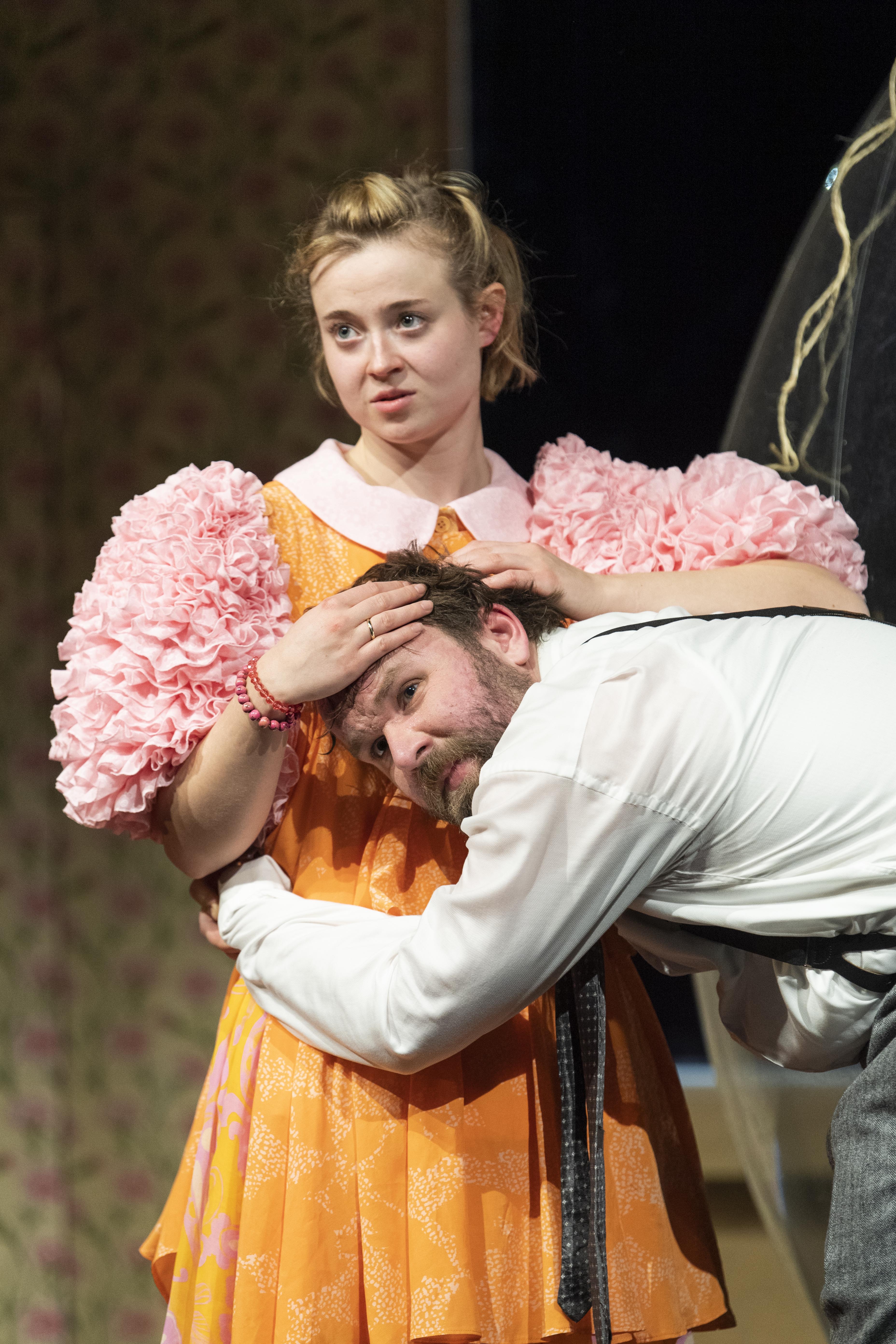 bei Pinneberg wahrscheinlich ein schwerwiegendes „Burnout-Syndrom“ diagnostizieren. Hans Fallada gibt dem „kleinen Mann“ eine Stimme, der sich in der Welt versucht durchzukämpfen. Pinneberg, der immer wieder auf Hindernisse trifft, ist so herzzerreißend und dramatisch, dass man selbst als Zuschauer immer wieder hofft, dass er in jedem Moment doch noch das Glück erfährt. Und tatsächlich erscheinen die personifizierten Hoffnungsschimmer immer wieder, sei es die Tochter seines Chefs, Marie Kleinholz, die ihn nicht bei seinem Chef verrät oder sein Arbeitskollege Heilbutt (Christian Czeremnych), der ihm hilft, die Verkaufsquote zu erreichen. Jedoch endet damit der Teufelskreis nicht. Dieser Teufelskreis und die Auswirkungen der Wirtschaftskrise erscheinen schließlich auch in Persona auf der Bühne mit einer echsenartigen Teufelsmaske (Kostüm: Cary Gayler), die Pinneberg noch bis zum Schluss des Stücks verfolgen wird.