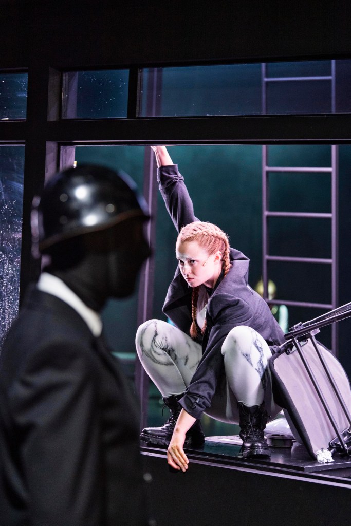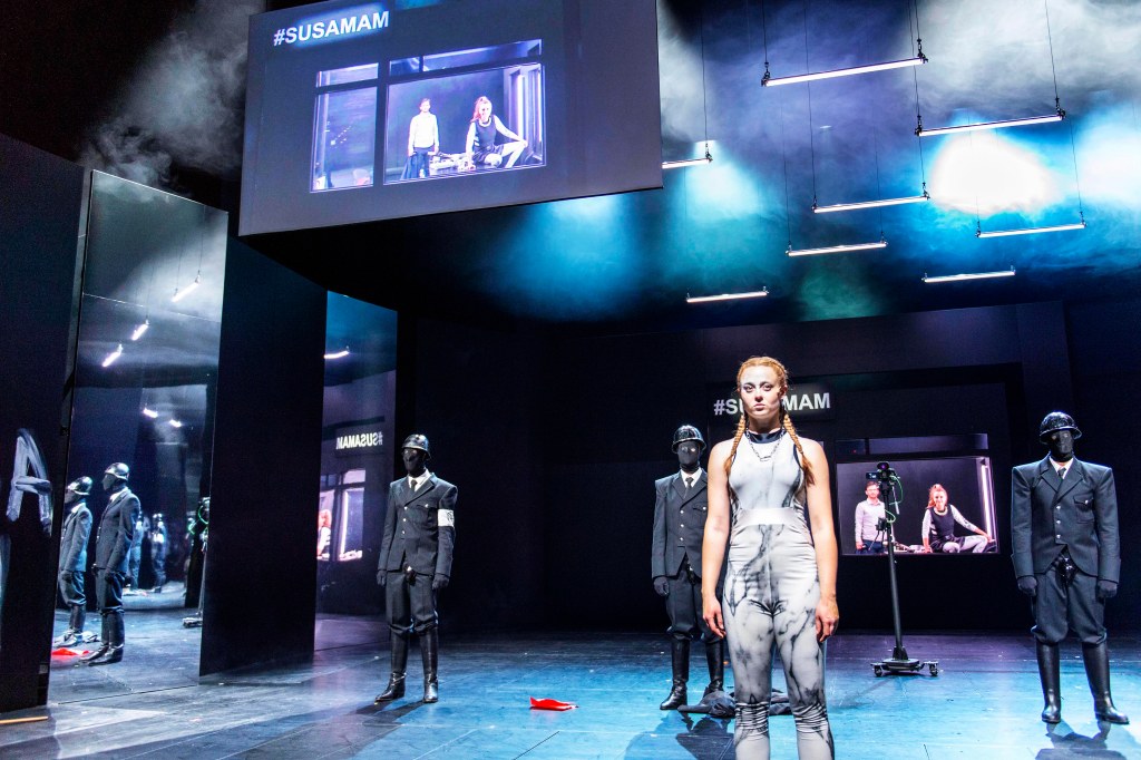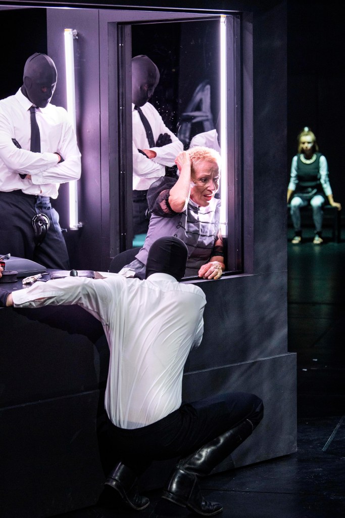 Bemängelt mancher Kritiker in der heutigen Zeit das Überwiegen von Effekthascherei, so ist in dieser Inszenierung der Schwerpunkt eindeutig auf das gesprochene Wort gelegt (Dramaturgie: Nadja Groß). Außer den gelegentlichen Überfällen durch mit schwarzen Masken unkenntlich gemachten Männern in Anzug-Uniform ist wenig Bewegung auf der Bühne, wobei sie genau wie die immerwährende Dunkelheit eine bedrückende immer präsente Gewalt vermitteln und Assoziationen mit Soldaten des Naziregimes hervorrufen (Kostüme: Anna Sünkel). Zum Teil spielt sich das Geschehen auch verdeckt ab. Hinter dem Erzählerhäuschen erahnt man einen weiteren Raum. Eine Zelle, wo abwechselnd die gefangen genommenen Frauen einsitzen. Die Furcht vor Folter und Tod, die auch Akhanli erfahren musste, sitzt dem Stück wortwörtlich im Nacken.