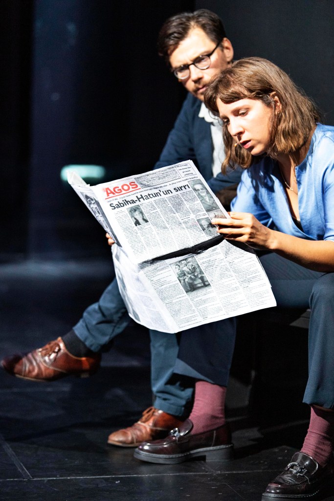 Wie verarbeitet Akhanli bzw. Çalış also diese Masse an Informationen, die allein durch die hier angerissenen Hinweise schon zu erahnen ist? Zum einen durch zwei dem Geschehen folgenden und aufzeichnenden Erzählern: Doğan Akhanli selbst (Christoph Gummert) und Christa Wolf (Lena Geyer) sitzen gleich zu Beginn in einer geschützten, aber in völliger Schwärze versinkenden Schreibstube in Form eines Kubus (Bühne: Anne Ehrlich). Die Bedrohung von außen symbolisiert durch die Dunkelheit ist das ganze Stück über präsent. In dem Kasten sammeln Akhanli und Wolf alles Material, das in das Stück fließen sollen. Sie berichten aus ihrem Leben, erläutern politische Kontexte, sind aber wie Gummert einmal auch zitiert: Märchenerzähler, sogenannte „Meddah“, obwohl kaum etwas so klingt als entspringe es den launigen Erzählungen der alten Kaffeehäuser, doch er ist es, der Geschichte flüssig macht, sie Stränge ineinander fließen lässt.