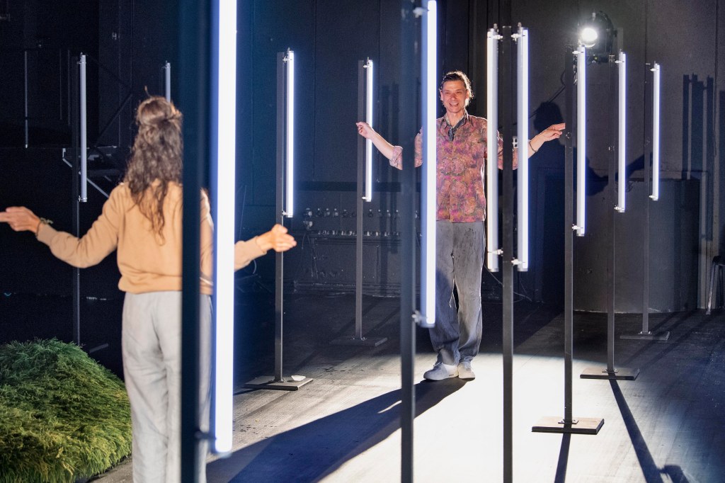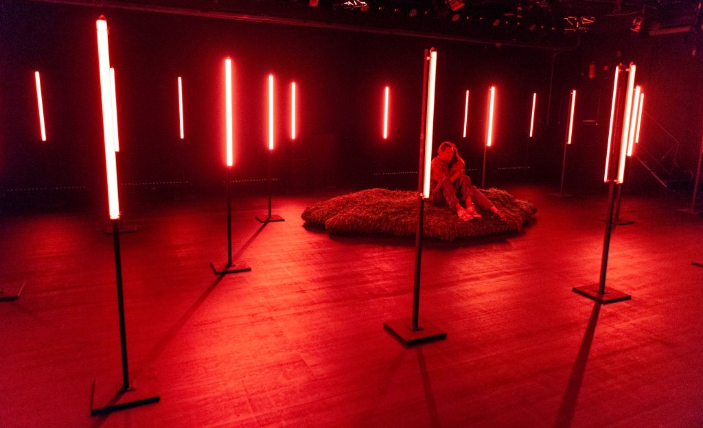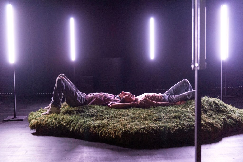 Wildfire Road beginnt mit einer minimalistischen Bühne mit Lichtern und einem Hügel Gras (Bühne: Marie Häusner). Und mit zwei Menschen wie Du und Ich: Dave (Sören Wunderlich) und Mariella (Sandrine Zenner). Die Geschichte wird dann sozusagen von hinten aufgerollt. Dave und Mariella erinnern sich an die Geschehnisse, die sie auf diesen Grashügel gebracht haben. Auch wenn sehr schnell klar ist: Erinnern, das ist immer auch ein bisschen mit Fehlern und subjektiver Interpretation verbunden.
