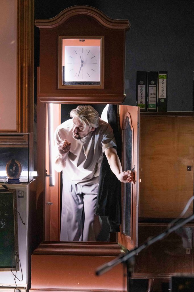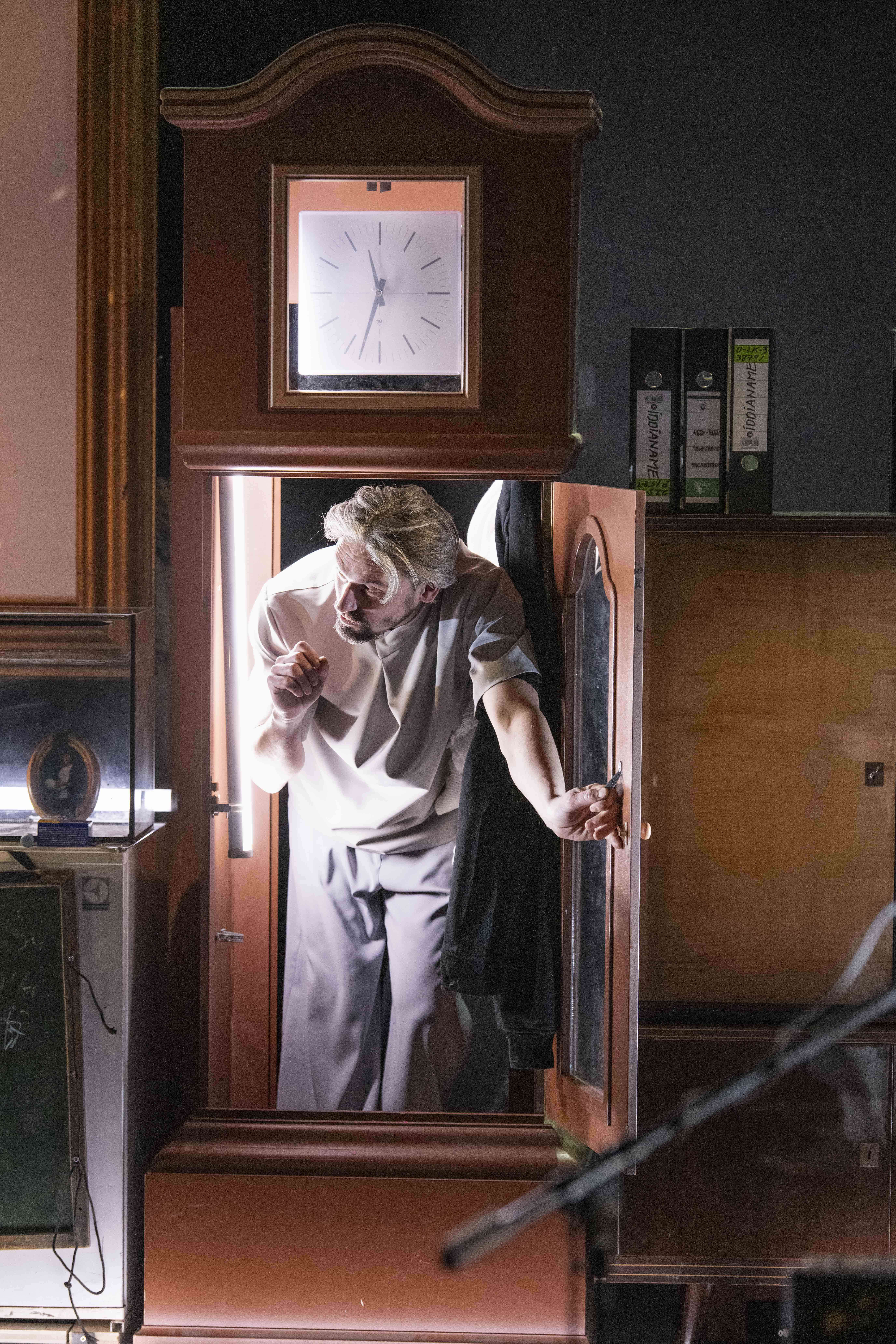Die Bühne ist dementsprechend gestaltet: antiquierte Möbel, eine große Standuhr und Aktenschränke bestimmen das Bild. Drei Schreibtische sind frontal auf die Zuschauer gerichtet (Bühne: Simon Solberg). Noch bevor ein Mensch zu sehen ist, ertönt eine Lautsprecherstimme, die den Zuschauern Fragen wie aus dem Lehrbuch der Psychoanalyse stellt: „Was macht Ihr Sein/Wesen aus? Warum sind Sie hier? Wann war der Punkt Ihrer Entscheidung?“ Noch bevor sich die Zuschauer zu den Fragen nähere Gedanken machen können, purzeln aus Schränken und der Uhr Alois, Paul und Sandrine. Sie tragen weiße Kleidung, die stark an die von Krankenhauspersonal erinnert, irgendwie klinisch (Kostüme: Annika Garling). Doch anstatt auf der berühmten weißen Liege des Herrn Freud in das tiefste Innere ihrer Patienten einzudringen, haben die drei ganz eigene Probleme: Sie sind für die Archivierung des Kollektiven Gedächtnisses der Gesellschaft zuständig. Sie sind sozusagen die modernen Mnemones. Keine leichte Aufgabe. Denn wonach sucht man aus, was in dieses Gedächtnis eingespeist werden soll? Woran sollten sich immer alle erinnern? Daher bekommt der Zuschauer ein recht flaues Gefühl, als alle Ordner, die die drei aus den Schränken ziehen, leer sind. Doch bald stellen sich den drei Archivaren noch ganz andere Probleme, die noch viel grundsätzlichere Fragen aufwerfen: Können wir uns überhaupt erinnern und ist das, an das wir uns erinnern nicht eine gewollte Halluzination unseres Gehirns? Treffen wir häufig falsche Entscheidungen, weil wir unser Hirn immer den bereits einmal beschrittenen Weg gehen lassen, ohne es zu zwingen, neue Wege auszuprobieren?