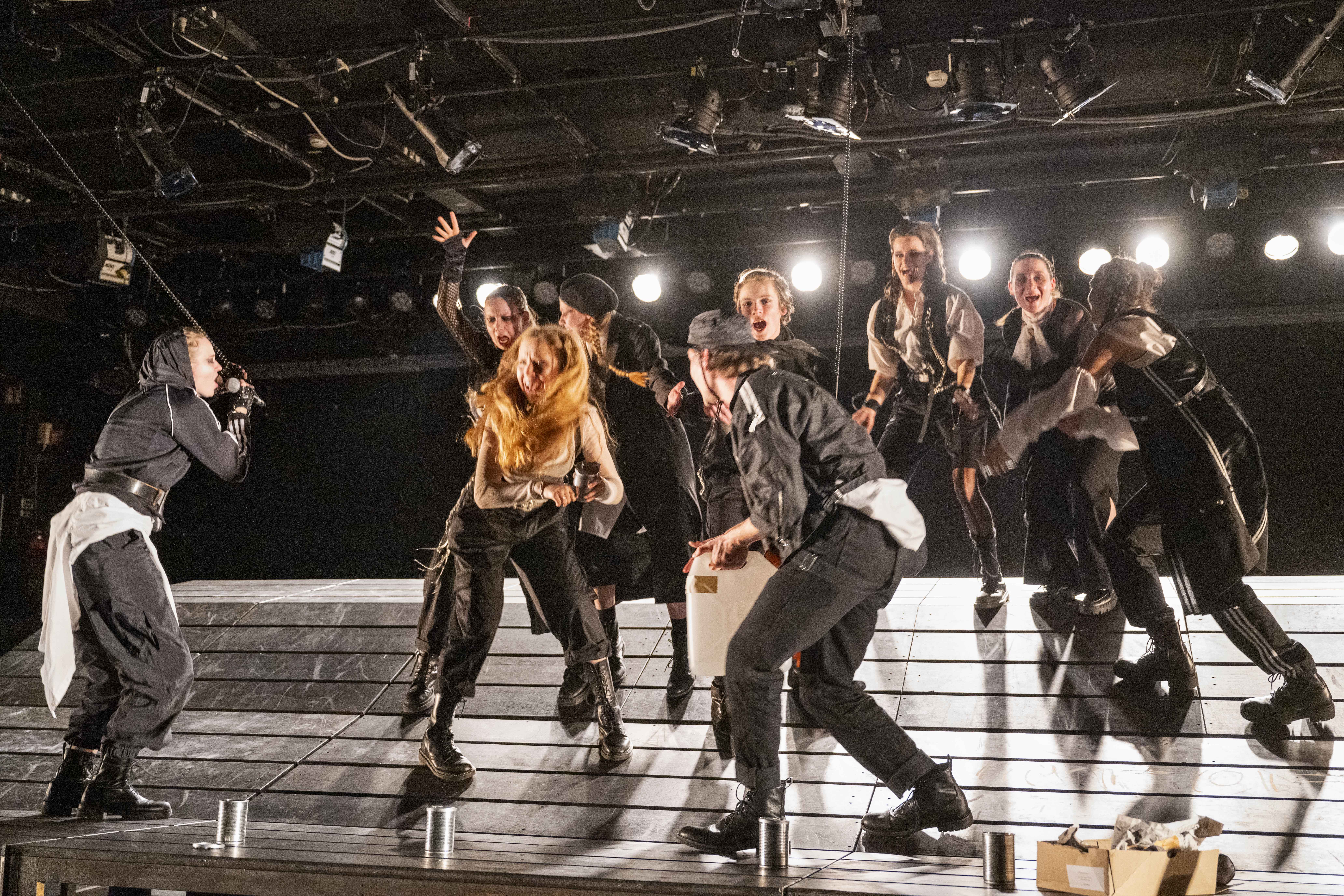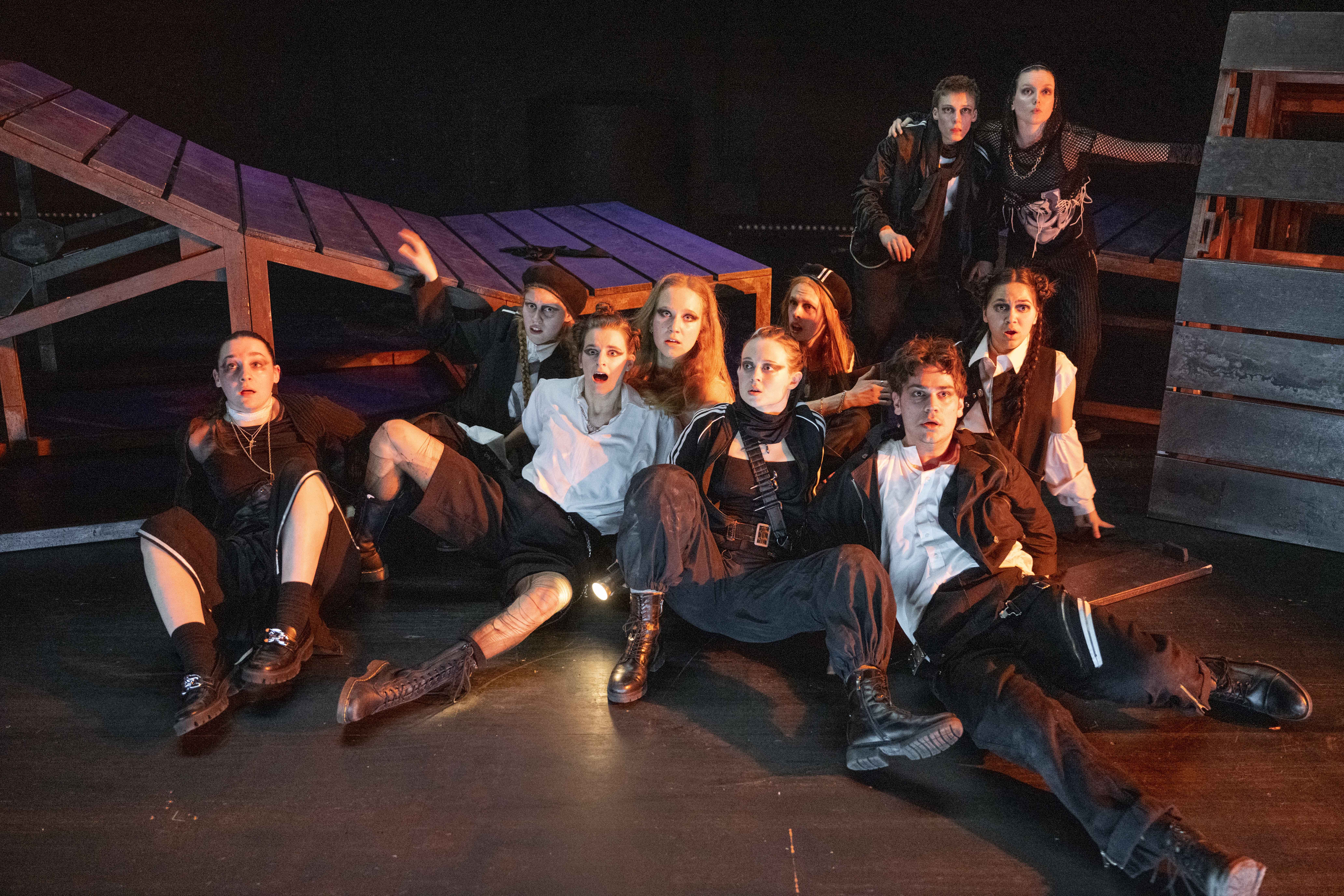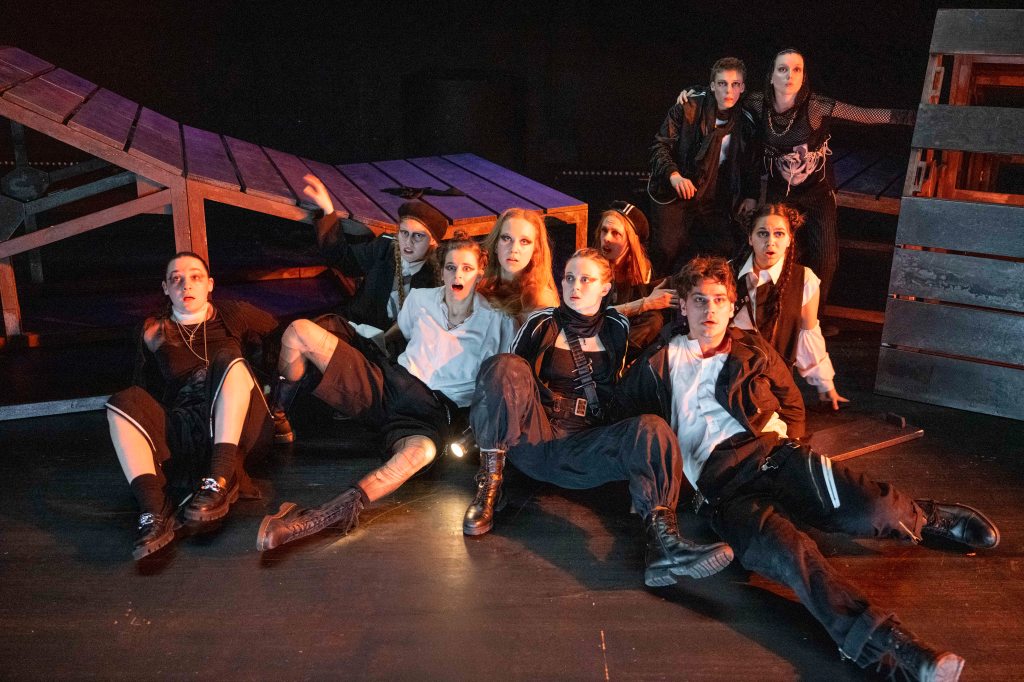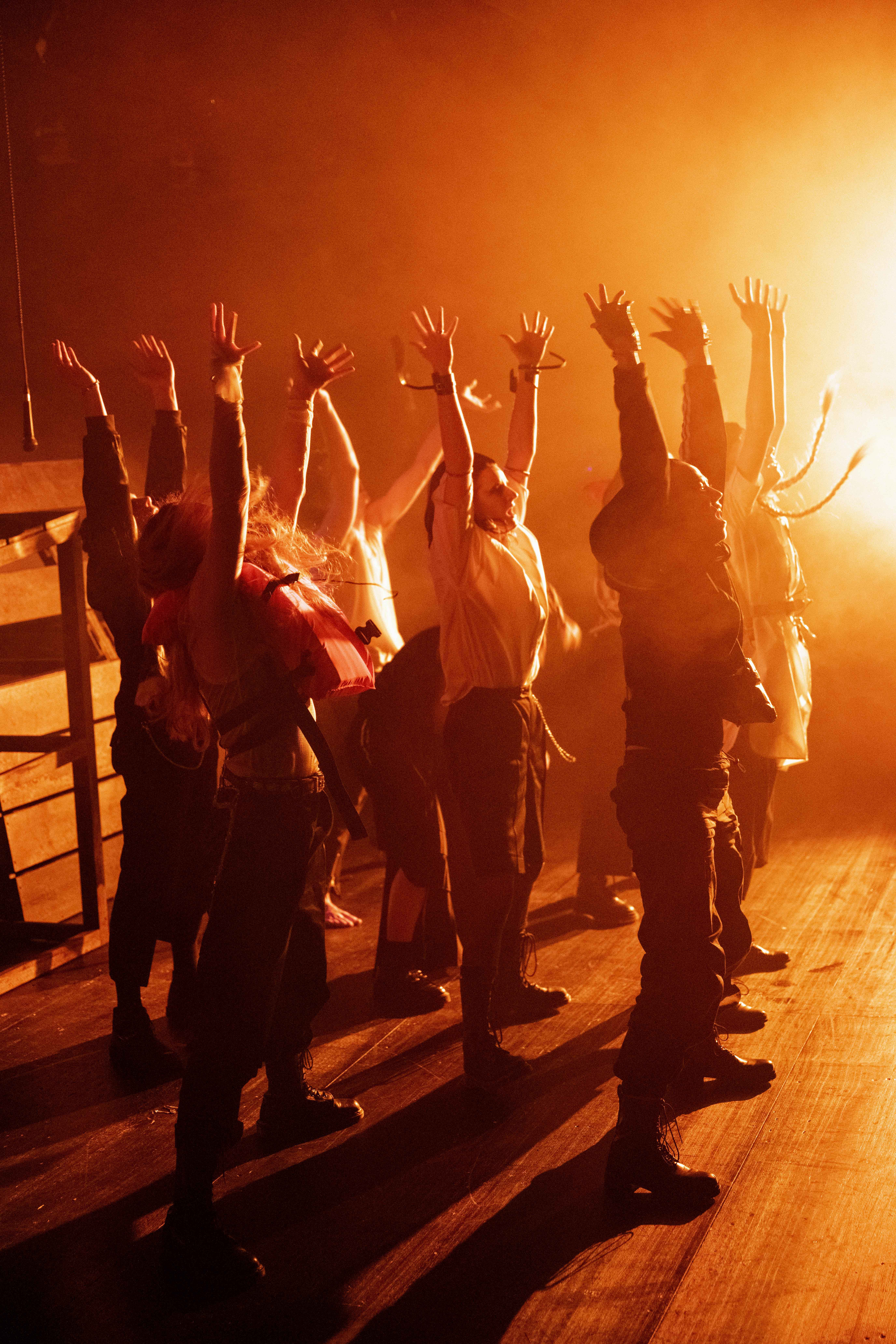 Die acht Jugendlichen (Leilani Basu Weidner, Hektor Heyer, Daniel Meißner, Mette Schneider, Sinja Schulze Messing, Farina Schumann, Klara Siegel, Frieda Wirkus) spielen die verzweifelt auf hoher See Treibenden mit großem Elan und Spaß an der Aufführung. Sie führen das Publikum authentisch und gekonnt durch die Themen der Inszenierung: Zukunftsängste, Dauerkrisenstimmung und wahrgenommen Machtlosigkeit der jetzigen nachwachsenden Generation.