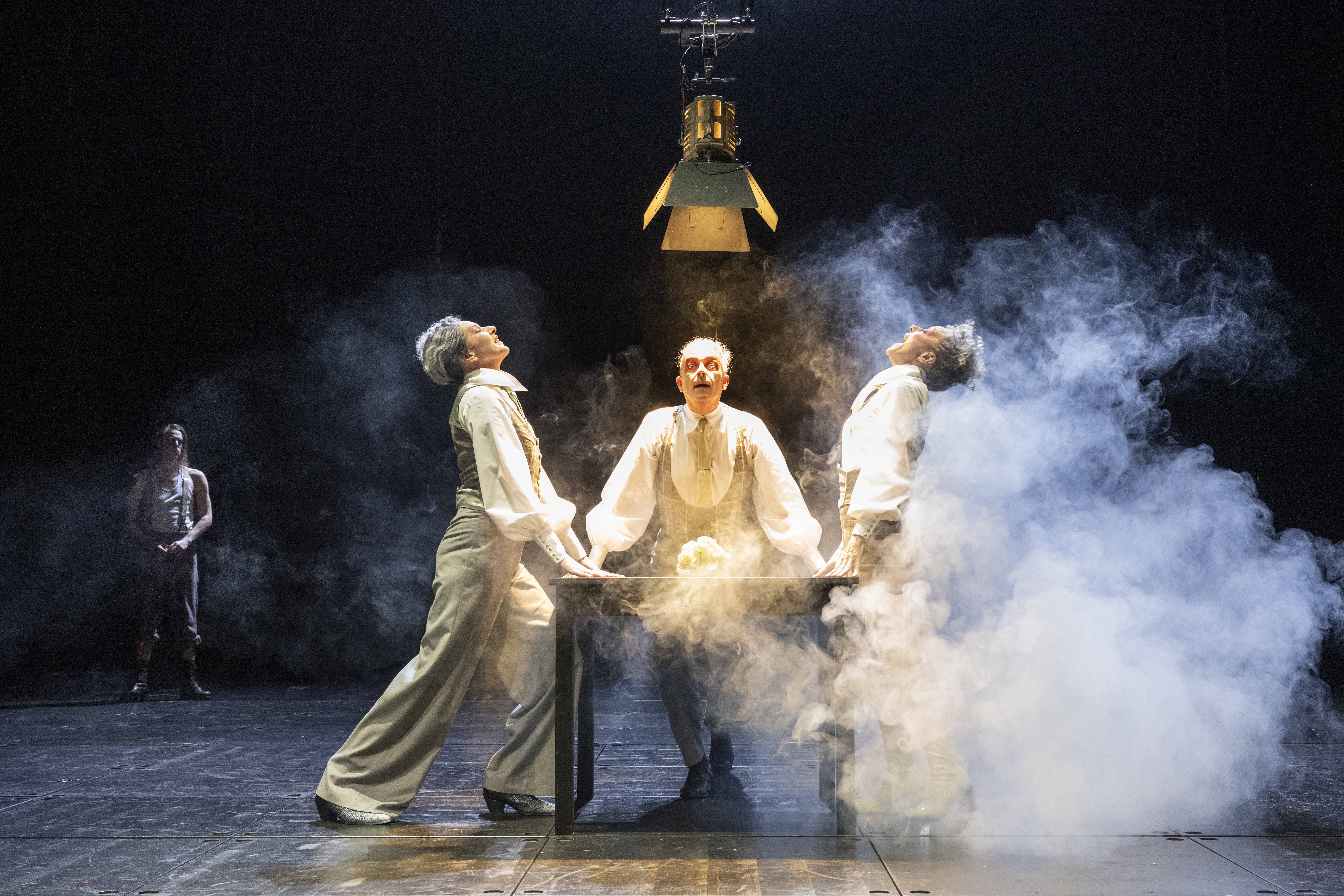 Kählert, der sonst immer eine gute Figur auf der Bühne macht, überzeugte als verratener Ernesto nicht ganz, manchmal wirkte er etwas steif in seiner Rolle, auch wenn sein Tod gerade durch die Freundschaft und Loyalität zu Ui, die Kählert durchaus überzeugend vermittelt, anrührt. Dagegen machte es Lena Geyer und Jakob Z. Eckstein sichtlich Spaß in die Rollen der Giri und des Givola, zweier äußerst brutaler Gangster für die Hermann Göring und Joseph Goebbels Pate standen. Geyer variiert das irre Lachen, das die genauso irre Giri auszeichnet, bis zur Schmerzgrenze und jagt den Zuhörern sicher den ein oder anderen Schauer über den Rücken; Eckstein hingegen verkörpert eine gefährliche Mischung aus Verführer und Killer. Arturo hängt er ergeben wie ein Hund an der Leine, Ernesto erschießt er ohne mit der Wimper zu zucken. Die beiden erscheinen androgyn, wie ein zweieiiges Zwillingspaar, das die Drecksarbeit für Arturo erledigt. Geyer und Eckstein ergänzen ihre Rollen perfekt und sorgen für eine Atmosphäre der Angst im Saal.