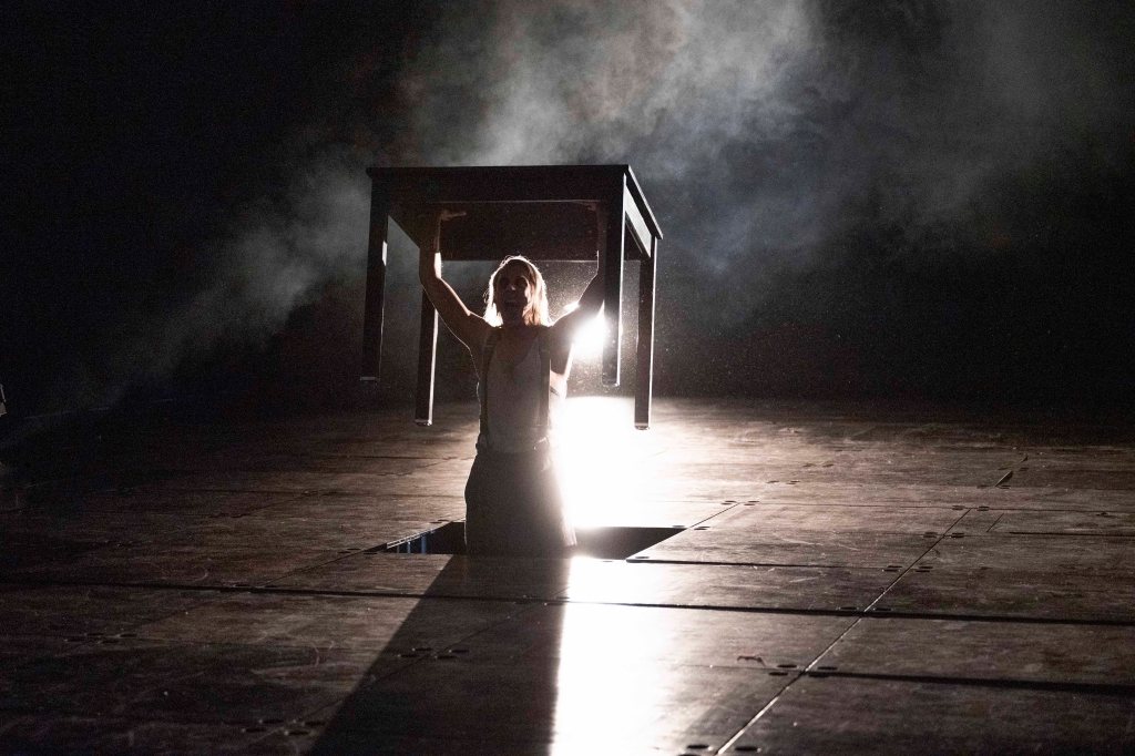Laura Linnenbaum hat bereits in ihrer letzten Brecht-Inszenierung (DIE HEILIGE JOHANNA DER SCHLACHTHÖFE 2017) eine Vorliebe für den mehrstufigen Bühnenaufbau gezeigt. Die Stufen, die den sozialen Auf-und Abstieg immer wieder ins Gedächtnis rufen, werden stets variiert. Dazu sind vor allem einfache Holztische ein willkommenes und flexibles Element, aus dem sich Besprechungstafeln sowie Laufstege zaubern lassen (Bühne:Valentine Baumeister). Ansonsten werden nur wenig Requisiten verwendet. Mal ein Papierschiffchen als Hafensymbol, dann ein riesiger Vorhang, der Tischtuch und Kaisermantel zugleich ist.