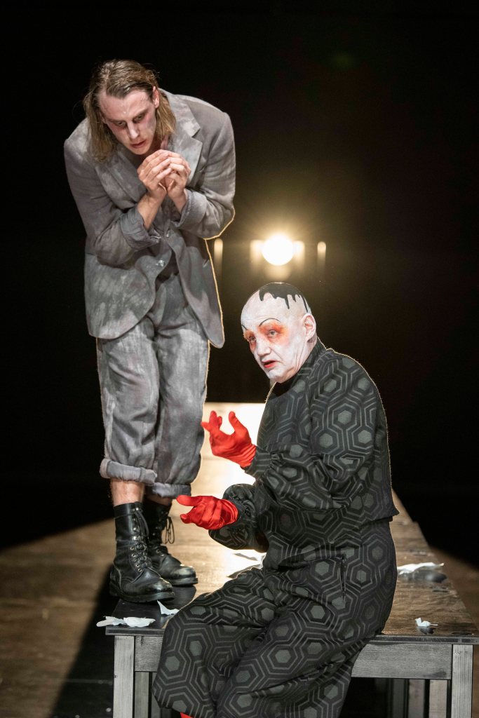 Die Mehrfachbesetzung bereitet außerdem wenig Probleme, da die Rollen so stark auseinander gehen, dass eine Verwechslung ausgeschlossen ist. So spielt Bernd Braun zu Beginn den Ansager, auftretend als Bertolt Brecht persönlich, dann einen Schauspieler, der Arturo beibringen soll, wie man sich richtig bewegt und spricht: „Man hat mir zu verstehen gegeben, dass meine Aussprache zu wünschen übrig lässt. Und da es unvermeidlich sein wird, bei dem oder jenem Anlass ein paar Worte zu äußern, ganz besonders, wenn’s einmal politisch wird, will ich Stunden nehmen. Auch im Auftreten.“ Herrlich kostümiert wie ein Harlekin aus der Comedia dell’arte und Gustav Gründgens Mephisto lässt Braun Arturo lächerliche Geh- und Sitz-Übungen vollbringen (ähnlich den Anweisungen, die Goethe einst für seine Schauspieler aufschrieb) und Shakespeares Cäsar zitieren. Doch so komisch das ganze anfangs auch wirkt, schnell wird klar, worauf Brecht hier sehr lang und breit anspielt: Auf die Hitler so eigentümliche Sprechweise sowie seine Bewegungen, die ebenfalls einen theatralischen Effekt hatten. Bis heute fragt man sich, wie Menschen von so etwas fasziniert sein konnten, aber wie die Geschichte zeigt, hat es funktioniert und auch bei Arturo wird es funktionieren – und das Schauspiel half ihm dabei. Vielleicht eine oder die bitterste Selbsterkenntnis für dieses.