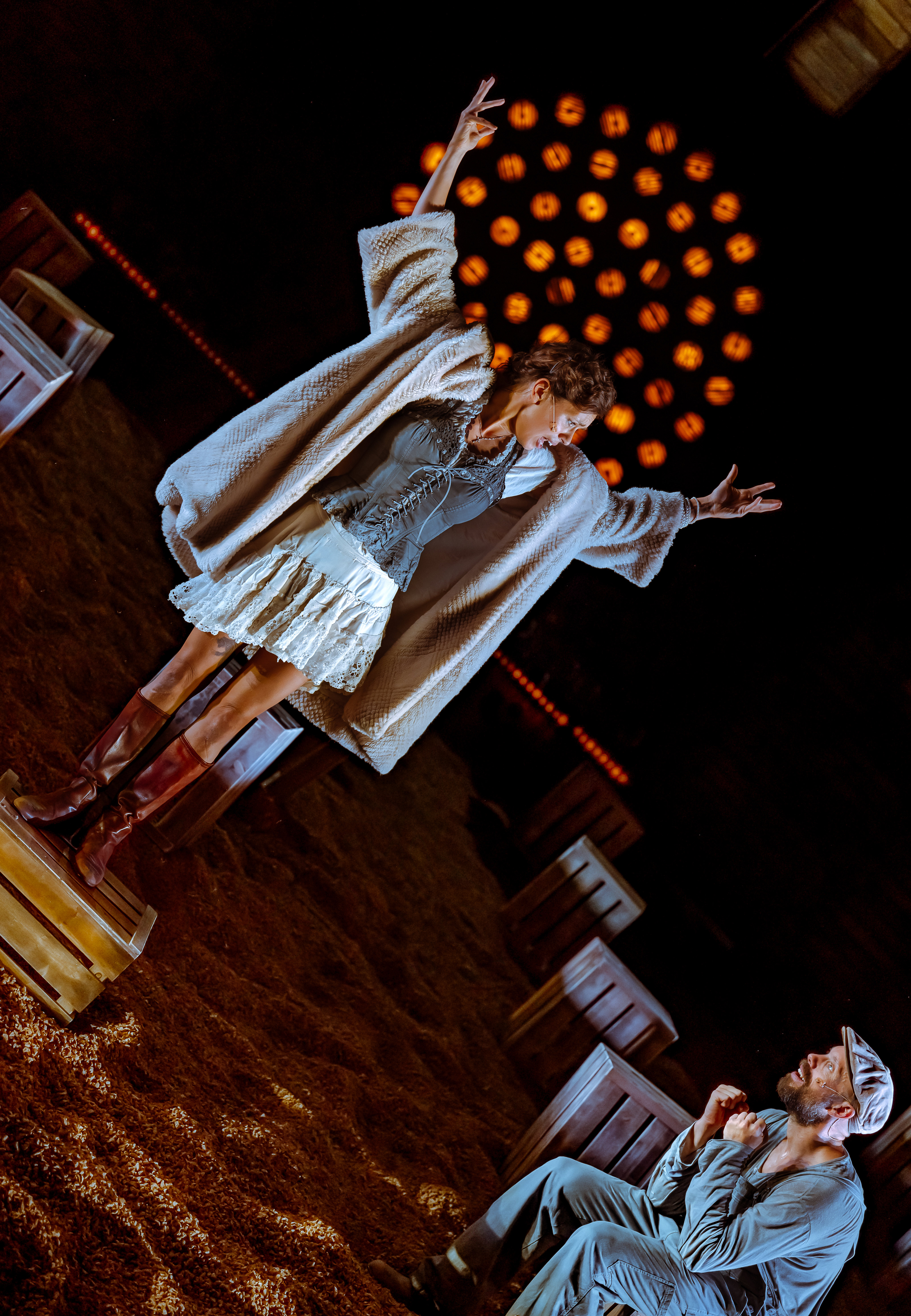 Das Farmleben könnte soweit ruhig verlaufen, wären da nicht Curley (Max Wagner), ein hitzköpfiger Boxer und Sohn des Chefs und dessen Frau (Julia Kathinka Philippi). Die beiden machen auf ihre je ganz eigene Art den Arbeitern zu schaffen. Curleys Frau leidet unter der eifersüchtigen Art ihres Mannes, der sie nie ausgehen lässt, sich aber auch sonst wenig um sie zu kümmern scheint. Zugleich stichelt sie die Arbeiter und ist arrogant, weil sie der Auffassung ist, dass sie eigentlich ganz woanders sein sollte. Auch hier baut Solberg noch ein Detail ein, das in der Vorlage nicht auftaucht: eine ungewollte Schwangerschaft, die mit dem Tod des Kindes endet. Vielleicht sollte so mehr Empathie für Curleys Frau hervorgerufen werden, da sie eigentlich kein wirklich sympathischer Charakter ist. Es werden von Solberg aber auch Szenen gestrichen bzw. ein Charakter weggelassen. Dazu zählt der schwarze Arbeiter Crook, der eigentlich das Rassismusproblem angesprochen hätte, welches aber in dieser Bühnenversion nicht zur Sprache kommt. Seine wichtigsten Texte werden von Curleys Frau übernommen, wodurch ihre Figur nicht nur mehr Text, sondern auch mehr Charakterfacetten erhält, mit denen Philippi spielen kann. Thomas Rothschild von der Nachtkritik vermutet, dass durch die Streichung der Rolle des Crooks die Blackfacing-Debatte umgangen werden sollte. Ob es nun dieser Grund oder andere gute Gründe gab, ein bisschen Schade ist es dennoch, da möglicherweise der Rassismus durch die Kriegs- und zukünftig sicher auch die Klimawandelflüchtlinge wieder beunruhigende Züge annehmen kann. Erste Vorboten finden sich immer wieder in den Nachrichten.