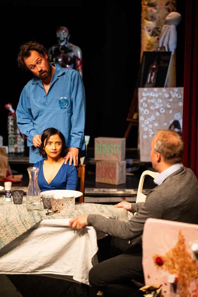 Dass viel Liebe in dieser Inszenierung steckt, sah man auch an dem aufwendigen Bühnenbild. Aus dem spießigen Bürgerhaus wird nach und nach ein Kunst-Schlachtfeld. Zum einen, weil Serge immer mehr seiner Kunstwerke ins Haus schmuggelt. Bald ist jede freie Ecke mit einer Kuriosität verschönert (Kunst: Till Meurer). Zum anderen, weil auch bei dem ein oder anderen Abendessen mal das Gemüse durch die Gegend fliegt. Und immer putzt Jessica besonnen und ohne zu meckern den Dreck weg. Das erinnert in mancher Hinsicht vielleicht an den berühmten Fettfleck von Jospeh Beuys, der einst ebenfalls einer Putzfrau im Museum zum Opfer fiel. Hier rührt auch der seltsame Titel EIN STÜCK PLASTIK her. Er spielt auf Serges Kunstwerk „Soziale Plastik“ an, die Jessica zeigen soll, wie sie jeden Dreck, den die Menschen verursachen, in ihrer ruhigen stoischen Art wegputzt.
