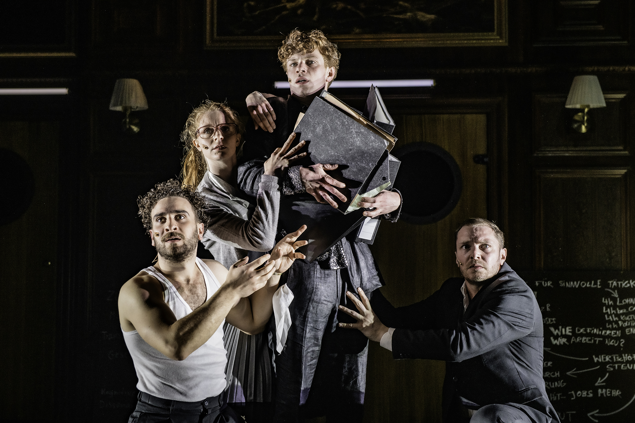 Regisseur Simon Solberg hat im Prinzip alle Mittel an der Hand, um eine spannende und kritische Auseinandersetzung mit den Ideen und Hoffnungen unserer Zeit auf die Bühne zu bringen. Leider springt der Funke nicht bei jedem über, weil die einzelnen Bestandteile aus Gesang und Information und der Rahmenhandlung nicht richtig ineinandergreifen. Die adaptieren Lieder mit ihren umgeschriebenen Texten sind leider nicht richtig zu verstehen und so, obwohl wir ihre inhaltliche Verbindung nicht bezweifeln, scheinen sie beinahe mehr dem Lückenfüllen für den Bühnenumbau zu dienen. Auch die zahllosen Namen werden nach einer Zeit nicht mehr innerhalb der Geschichte eingebunden, stattdessen tragen Voltaire, Rousseau, Elon Musk, und wie sie alle heißen, ähnlich einem Schulreferat ihre Ideen frontal dem Publikum vor. Ist das Überforderungstheater? Überfordert fühlt man sich in diesem Sinne nicht, denn man kann den Inhalten gut folgen, aber es ermüdet und macht weniger Lust sich mit der Materie weiter zu befassen. Dabei sprüht das Stück von vielen spektakulären Bühnenumbauten für die Solberg selbst verantwortlich ist. Und das macht es auf seine Weise sicher für den wissbegierigen Zuschauer wieder reizvoll. Auch da Publikum erhält eine kleine Aufgabe von der wir aber Schweigen, damit die Überraschung nicht verdorben wird.