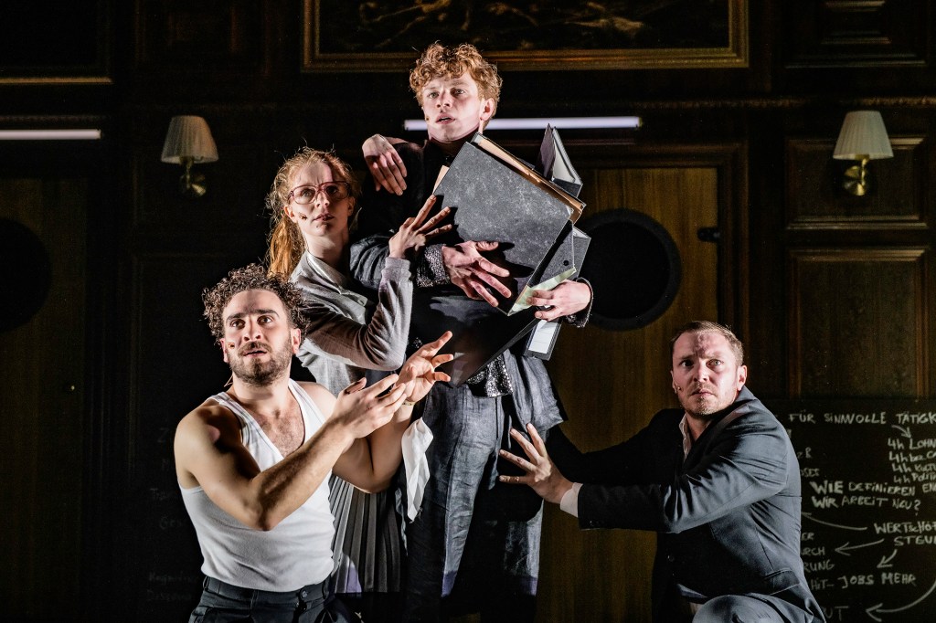 Simon Solberg zeigt eine erhebliche Ausdauer im Zusammensuchen von Informationen. Um es dem Publikum etwas zu erleichtern, werden die Namen und Gesichter der zahlreichen Denker*innen und Forscher*innen an die seitlichen Bühnenwänden projiziert. Für kleine Pausen sorgen musikalische Intermezzi. Diesen Umstand habe wir bisher noch gar nicht erwähnt, eigentlich ist der Abend ein Liederabend. Die Schauspieler*innen Julia Kathinka Philippi, Imke Siebert, Jacob Z. Eckstein, Riccardo Ferreira und Max Wagner haben an diesem Abend also alle Hände voll zu tun, nicht nur mit dem rasanten Rollenwechseln von Voltaire bis zu Silberfüchsen und Neandertaler (Kostüme: Ines Burisch), sondern auch mit den humorvoll umgedichteten Songs, die ein breites Spektrum von deutsch und englischsprachigen Songs abdecken. Für den nötigen Groove sorgen die Live-Musiker Jan Günther, Philip Mancarella und in wechselnder Besetzung Samuel Reissen / Nico Stallmann.