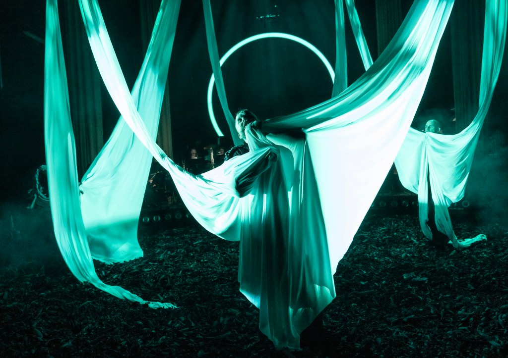 Passend zu den Kostümen präsentiert sich die Kulisse des Epos als düstere Arena der Antike: Die weißen verzierten Säulen im hinteren Teil der Bühne (Simon Solberg) und der prunkvolle Kronleuchter erinnern an die glorreichen Zeiten der Helden. Im Kontrast zu den Palastelementen steht der Mulch, mit dem der Boden der Bühne fast komplett bedeckt ist. Außerdem hängen Stofftücher und Schnüre von der Decke herab. Ergänzt wird das dystopische Schlachtfeld durch futuristische Elemente, wie eine Reihe von kleinen Scheinwerfern in einer Reihe, die an die Lampen eines Raumschiffs erinnern. Sie erleuchten nicht nur den Dreck auf dem Boden von Homers Palast, sondern heben mit ihrem Licht auch das schwarze Podest hervor, welches in der hinteren Bühnenmitte aufgebaut ist. Auf ihrem erhöhten Platz spielen hier die Musiker*innen des Beethoven Orchester Bonn und thronen mit ihren Instrumenten über dem Geschehen.