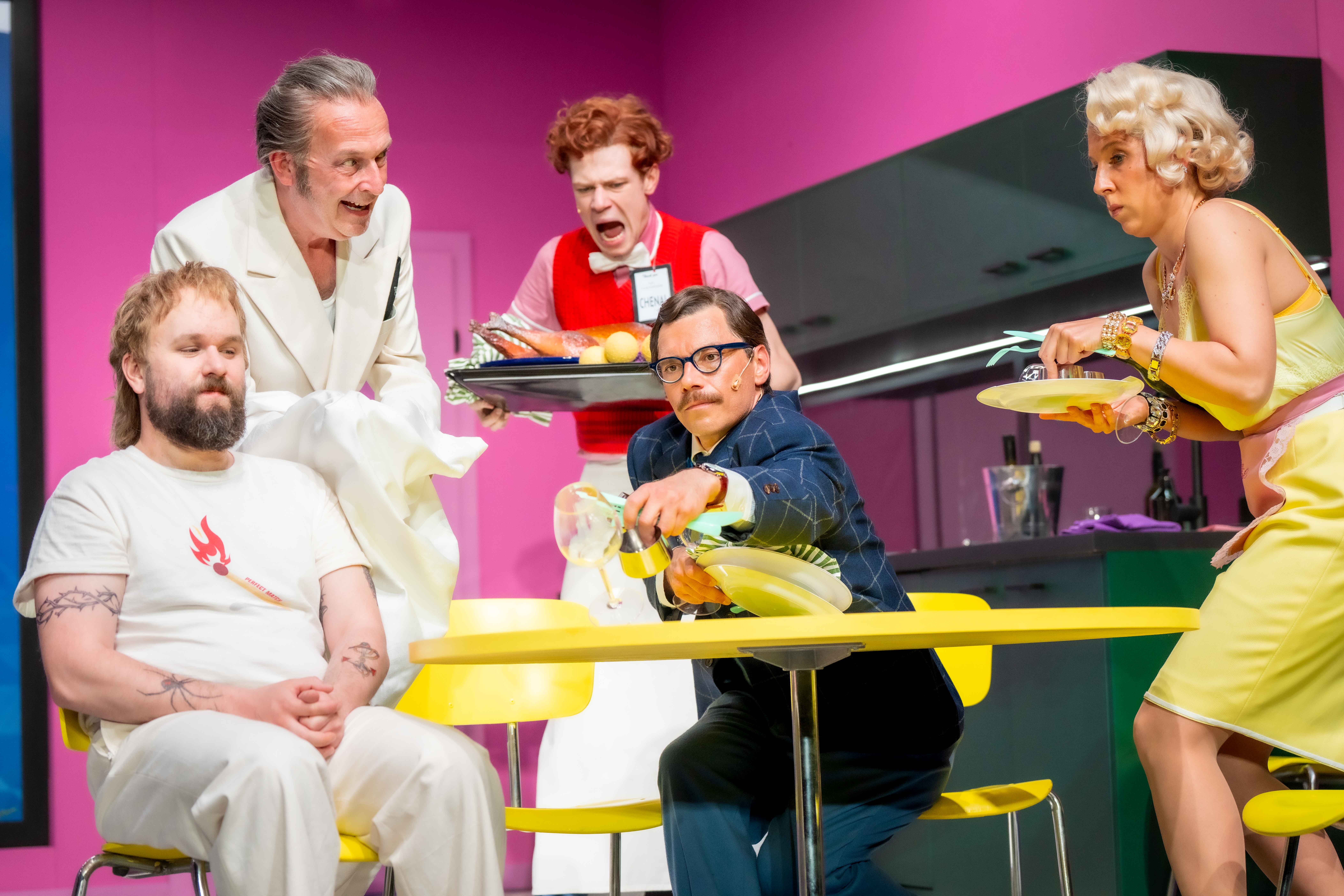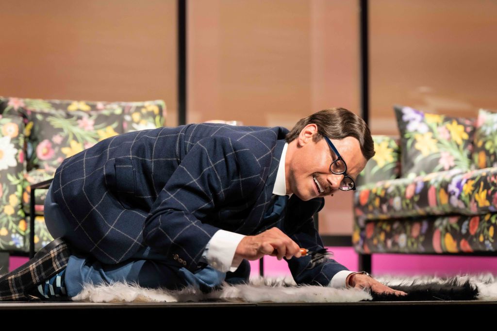 Das Ensemble überzeugt nicht nur durch seine Dialogsicherheit, die, stets an der Grenze zum Skurrilen, durch Max Frischs kontrastreiche Sprache hervorgehoben wird und die herrliche Absurdität der Unterhaltungen hörbar macht, sondern auch durch eine passend genaue Dosis Klamauk, die die Geschehnisse in ein tragisch-komisches Licht rückt. Auch während einiger potentiell langatmigen Szenen beweisen die Schauspieler:innen eine bemerkenswerte Ausdauer, Spontanität und glänzen durch ein nuanciertes Spiel. Zwischen dem Frisieren eines Teppichs und dem Rezitieren von Repliken aus Hofmannsthals „Der Jedermann“, gelingt es Ihnen, das Publikum immer wieder aufs Neue mit sich zu ziehen – und sich dabei zudem sehr musikalisch zu zeigen (Musikalische Leitung: Vivan Bhatti). Im Angesicht der bestechend unschuldigen Brandstifter in seinem Haus, schafft es ein brillanter Biedermann im Zwiegespräch mit der Gefahr immer wieder seine eigene artifiziell logische Argumentation und sich selbst dabei ad absurdum zu führen (Dramaturgie: Nadja Groß).