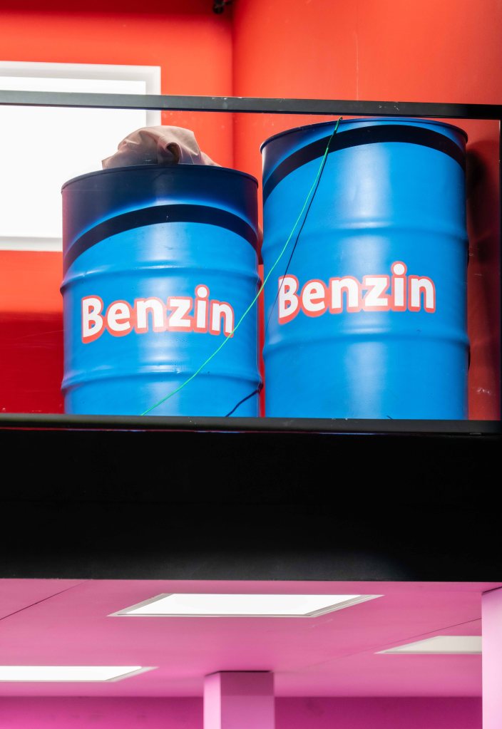 Schauplatz des Lehrstücks ist das schreiend bunte und extravagant eingerichtete Wohnhaus der Biedermanns (Bühne: Anne Ehrlich), das an die Suite eines Hotels in Las Vegas erinnert: Den gekachelten Boden mit Schachbrettmuster bedeckt ein flauschiger Teppich – ebenfalls mit Schachbrettmuster. Darauf thront ein bunt geblümtes Sofa. Die Wände sind in pink und blau gestrichen und stehen in Kontrast zu den quietschend gelben Stühlen in der Küche. Gekrönt wird der Regenbogen der Reizüberflutung mit einer grünen Beleuchtung (Licht: Thomas Tarnogorski). Mehr Spielfläche bieten die großzügige Fensterfront an der hinteren Bühnenwand sowie der gut einsehbare Dachboden in der Hochebene. Dieser wird nicht nur sichtbar von den Schauspieler:innen bespielt, sondern zusätzlich durch Live-Kameras (Video: Lars Figge) auf die Bildschirme links und rechts oben im Bühnenbild projiziert. Unter den Bildschirmen laufen gelegentlich Schriftzüge wie „Lehrstück ohne Lehre“ durch. Zu beiden Seiten der Bühne gibt es etwas Platz für ein paar Mikrofonständer, von welchen aus die Dialoge im Haus der Biedermanns gelegentlich von außen durch gesprochene Chorpartien ergänzt werden.