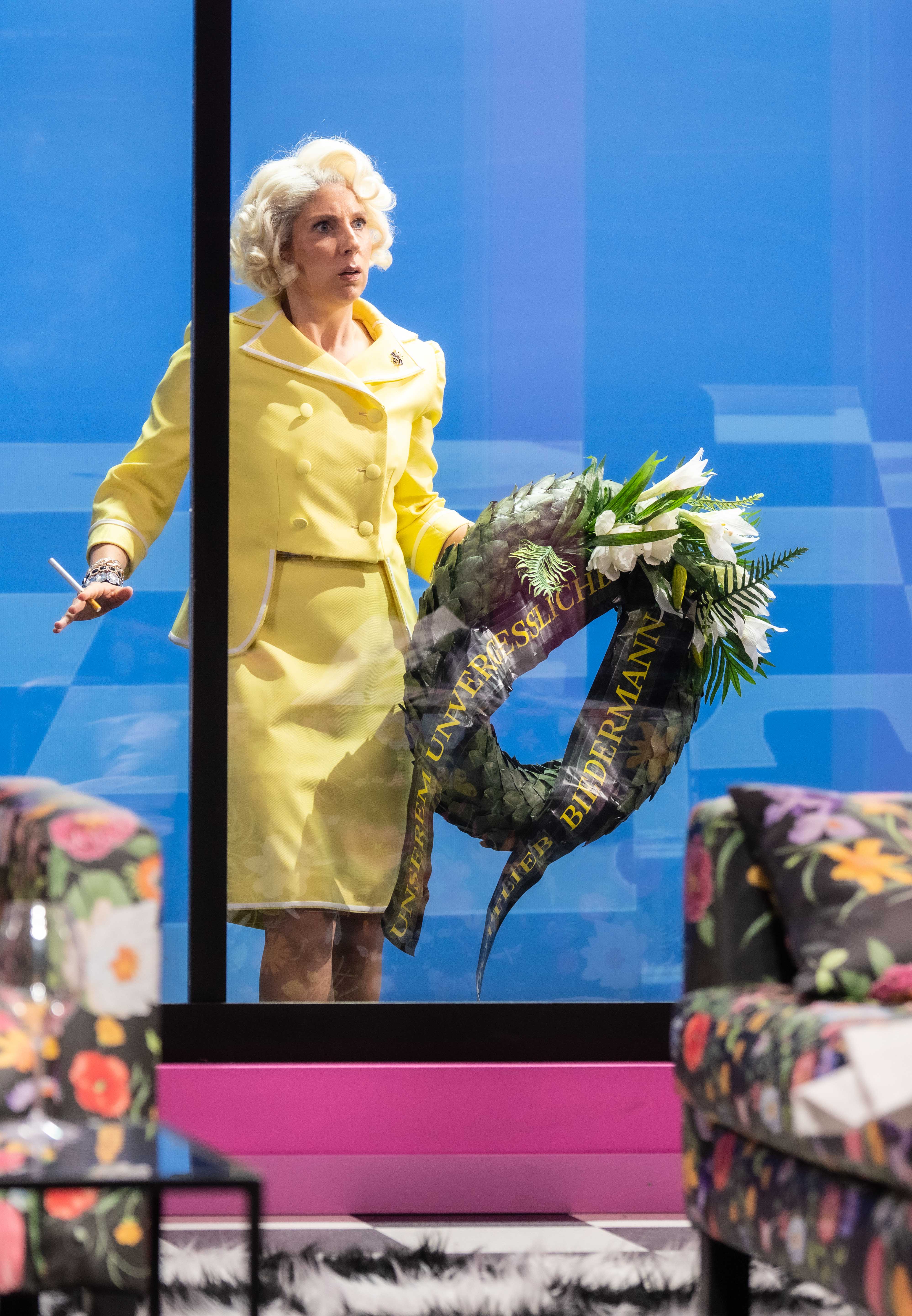 Als Vertreter der Bourgeoisie macht Gottlieb Biedermann (Christoph Gummert) seinem Namen alle Ehre: Gemeinsam mit seiner Frau Babette (Lena Geyer) lebt der erfolgreiche Fabrikant in einem großen Haus, in dem ihr Angestellter Anton (Jacob Z. Eckstein) penibel Ordnung halten muss. Ihr exklusiver Lebensstil spiegelt sich auch in der Kleiderwahl der Biedermanns wieder (Kostüme: Anna Sünkel): Während sich das Paar nur in den teuersten Einzelstücken in den grellsten Farben und Mustern und mit falschen Zähnen zeigt, trägt ihr Angestellter ein schlichtes Dienstoutfit mit Schürze und pastellfarbenem Hemd und Fliege. Auch die Berichte über die Brandstifter, die in der Stadt seit Neuestem ihr Unwesen treiben, können Biedermanns Idylle zwischen Designerklamotten und Silberbesteck nicht stören. Selbst als der wohlhabende Bürger zwei Unbekannte (Timo Kählert, Wilhelm Eilers), stets in der Farbe weiß der Unschuld gekleidet, in sein Haus einlädt und diese damit beginnen, Benzinkanister auf den Dachboden zu schleppen und Zündschnüre zu verlegen, versucht sich der Hausherr mit den potentiellen Brandstiftern anzufreunden. Während sich Biedermann weiterhin selbst belügt und sich hinter einer Fassade aus Toleranz und Selbstgefälligkeit in Sicherheit wiegt, begibt er sich schließlich sogar mit den Feuerteufeln zu Tisch…